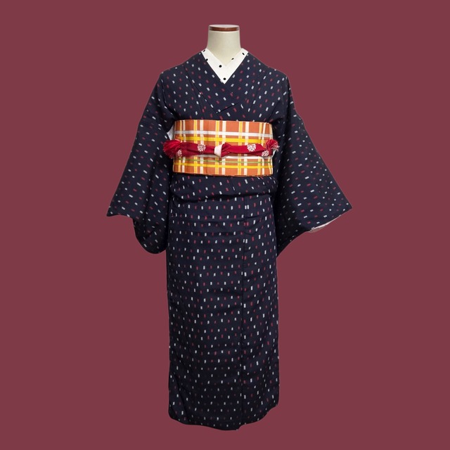 【アンティーク着物+半幅帯】 紺地のレトロな絣着物にオレンジ色のチェック柄半幅帯を合わせました。 お召しのような質感でとても着やすい着物。 帯は両面使える便利な帯です。米沢織物のしっかりした生地感です。 (着物) ・目立つ汚れはなく、状態は綺麗。 ・右後ろ袖部分に破れあり。 身丈:148㎝ 裄丈:63.5㎝ 袖丈:49㎝ 素材:絹 (半幅帯) •目立つ汚れはなく、状態は綺麗。 •ラベル付き 長さ:354㎝ 幅:15㎝ ※着物単品のお値段です。 半幅帯、半衿とセット購入も可能です。 オプションからお選びください。 ご覧いただきありがとうございます。 トラブル防止のため、以下の注意点を必ずお読みください。 【ご購入時の注意点 】 ●詳細な検品を心がけておりますが、シミ等の見落としがある場合があります。また、着用時に目立つ部分以外は表記をしておりません。何卒ご了承いただけますようお願い申し上げます。 ●サイズは1点ずつ手作業で採寸しております。多少の誤差が生じる場合がございます。 ●お使いの端末や閲覧環境により、写真と実物の色味や質感、サイズ感が多少異なって見えることがございます。色味が違うといった返品には応じかねます。 ●こちらの不備以外での返品や返金の対応はお断りしております。 ●宛先不明、住所記載間違いなど、お客様のご都合で商品が戻ってきた場合、着払いにて再発送させていただきます。 最後まで読んでいただき、ありがとうございました。 気になる点がございましたらお気軽にご質問下さい。