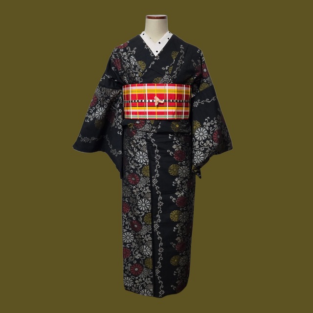 【アンティーク紬&格子柄の半幅帯】 黒地に光沢感のある菊模様が織り込まれた着物に朱赤色の格子柄の半幅帯を合わせました。 着物は光沢感、シャリ感があり、大島紬のような風合いです。 帯はシャリ感のある素材で裏表同じ柄です。 (着物) ・衿に汚れ有り。 ・その他所々白っぽい汚れ有り。 身丈:154cm 袖丈:50cm 裄丈:64cm (半幅帯) ・目立つ汚れはなく、状態は綺麗。 長さ:330㎝ 幅:14.5㎝ ※着物単品のお値段です。 帯とセット購入も可能です。 オプションからお選びください。 ご覧いただきありがとうございます。 トラブル防止のため、以下の注意点を必ずお読みください。 【ご購入時の注意点 】 ●アンティークのお品のため、シミ、傷、焼けによる変色などがございます。また、詳細な検品を心がけておりますが、シミ等の見落としがある場合があります。また、着用時に目立つ部分以外は表記をしておりません。何卒ご了承いただけますようお願い申し上げます。 ●サイズは1点ずつ手作業で採寸しております。多少の誤差が生じる場合がございます。 ●お使いの端末や閲覧環境により、写真と実物の色味や質感、サイズ感が多少異なって見えることがございます。色味が違うといった返品には応じかねます。 ●こちらの不備以外での返品や返金の対応はお断りしております。 ●宛先不明、住所記載間違いなど、お客様のご都合で商品が戻ってきた場合、着払いにて再発送させていただきます。 最後まで読んでいただき、ありがとうございました。 気になる点がございましたらお気軽にご質問下さい。