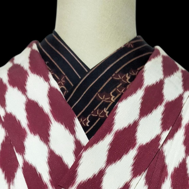 【送料無料】 黒地によろけ縞と紅葉が描かれたシックな色柄のアンティーク生地で作った半衿。 アンティーク着物ならではの柄がとてもかわいいです。 大正ロマンな雰囲気がお好きな方は是非! 普段着着物はもちろん、振袖や袴に合わせても可愛いです! 生地が薄い為、破れやすいです。 ピンキングハサミでカットしています。 縦の片方は耳を使用しており、切り込みがございます。 サイズ:15cm×110cm 素材:絹 【ご購入時の注意点 】 ●アンティーク生地を使用して、1つ1つ手作業で制作しているため、色や形に若干の違いが生じる場合がございますのでご了承ください。 ●お使いの端末や閲覧環境により、写真と実物の色味や質感、サイズ感が多少異なって見えることがございます。 ●こちらの不備以外での返品や返金の対応はお断りしております。 ●宛先不明、住所記載間違いなど、お客様のご都合で商品が戻ってきた場合、着払いにて再発送させていただきます。 最後まで読んでいただき、ありがとうございました。