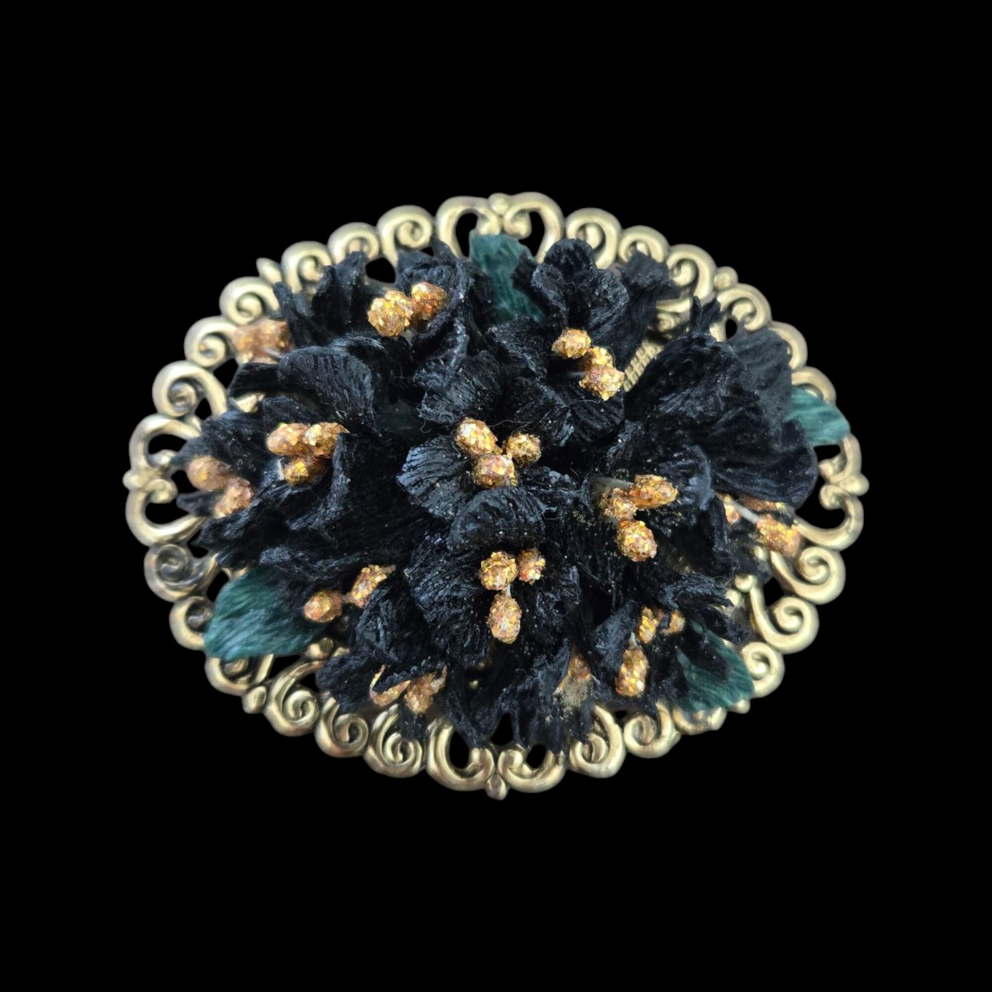 ゴールドの台座に黒い花が綺麗な大ぶりのアンティークブローチに帯留金具をつけました。