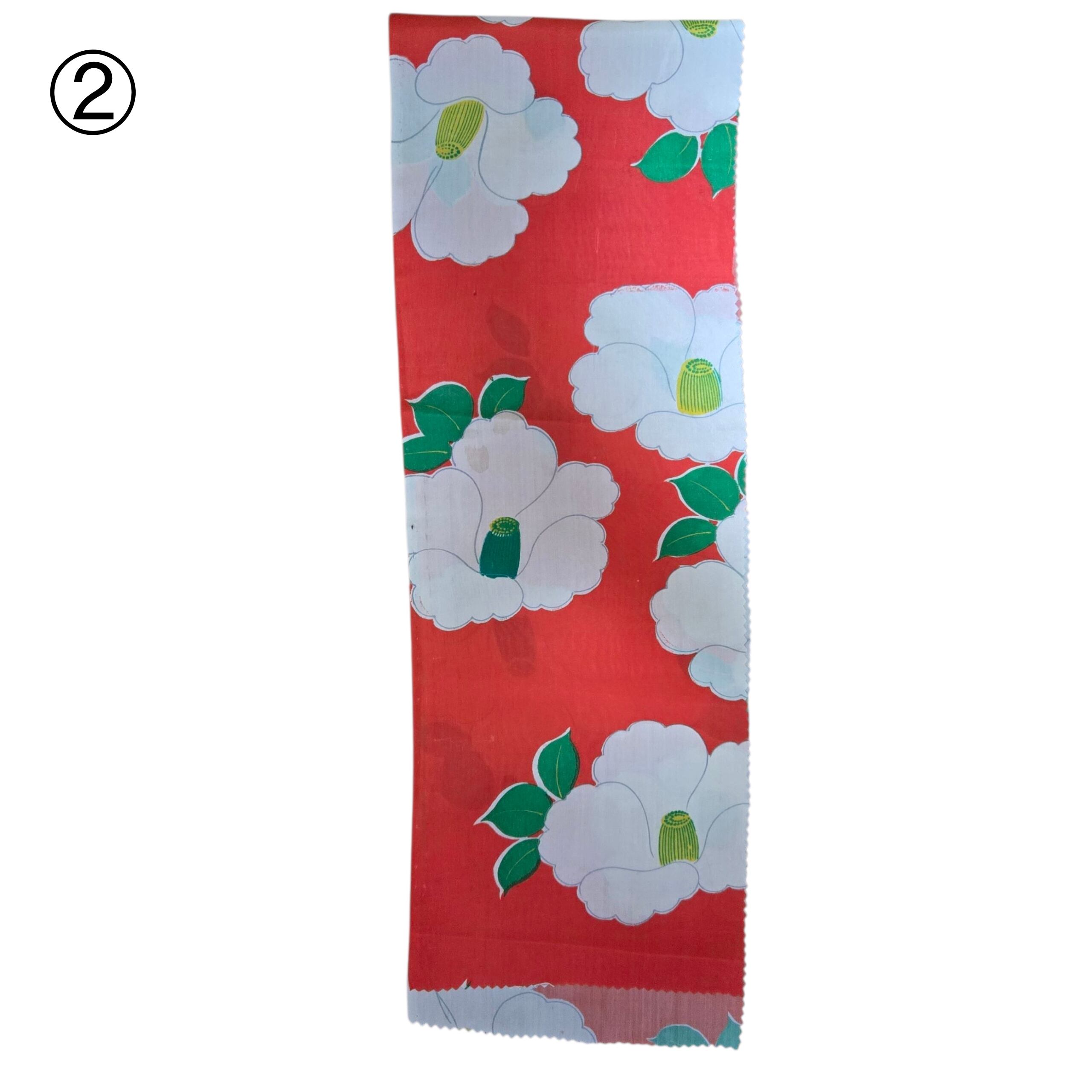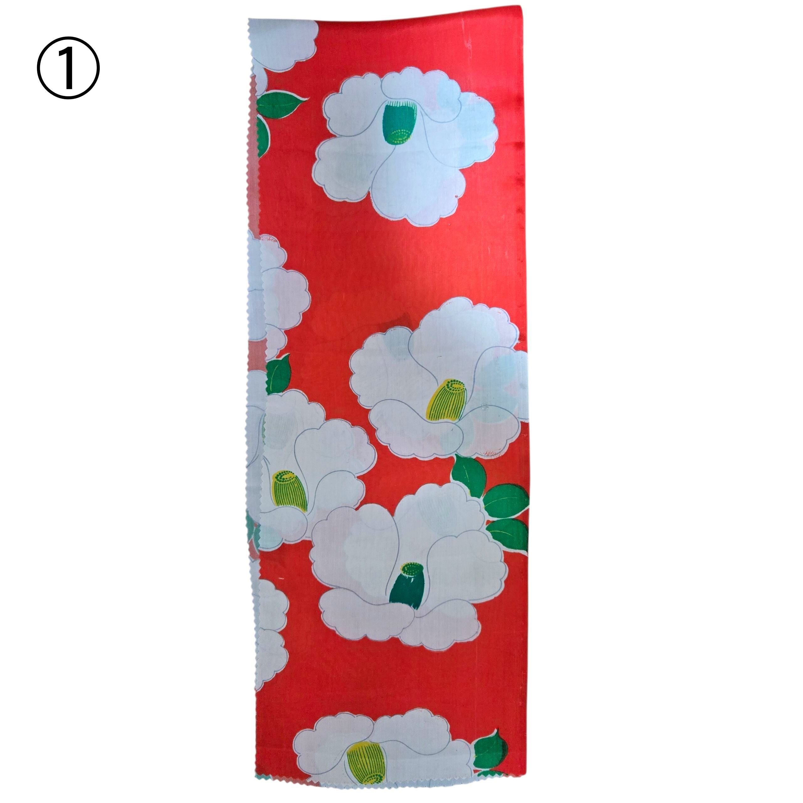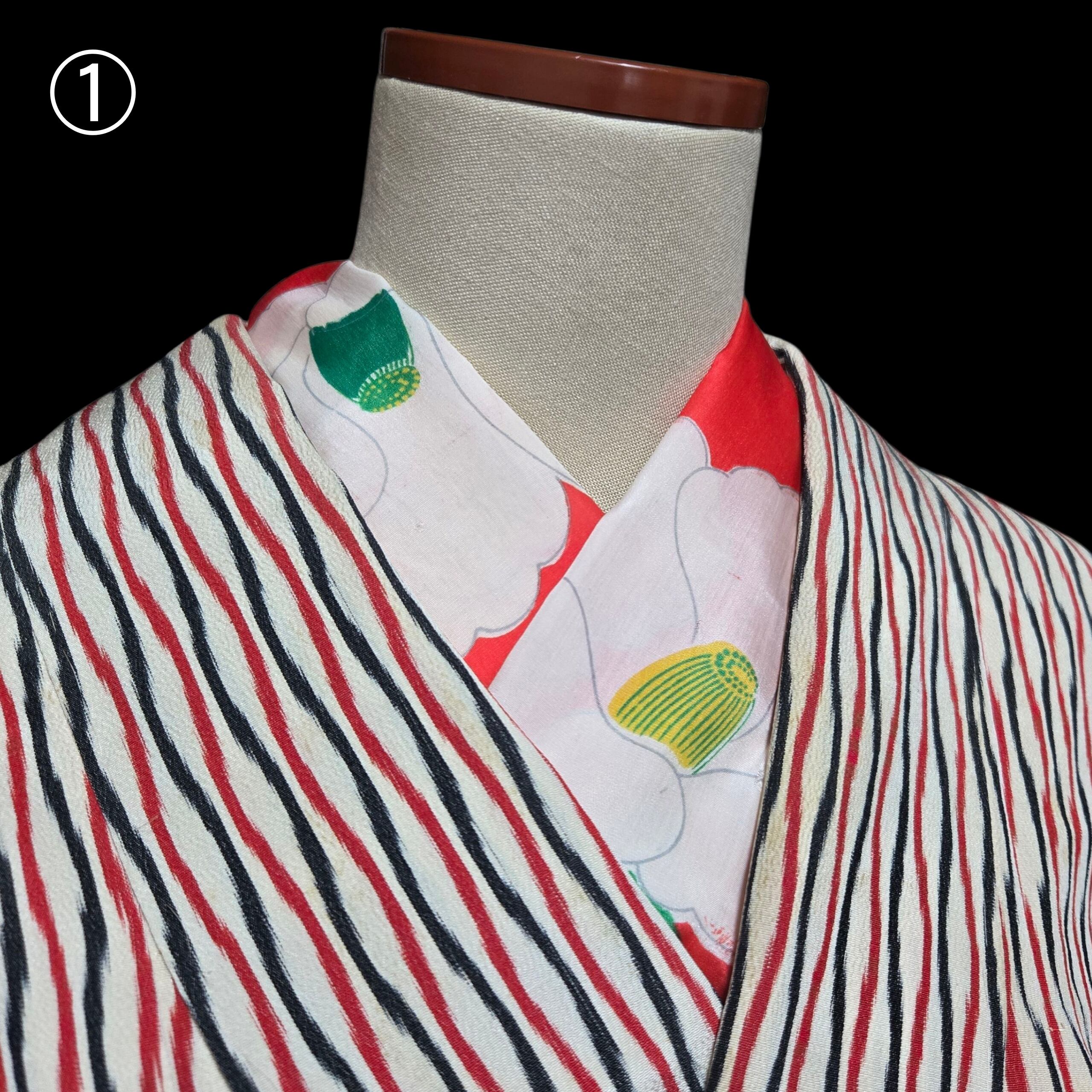朱赤地に生成り色の椿が華やかなアンティーク生地で作った半衿。
