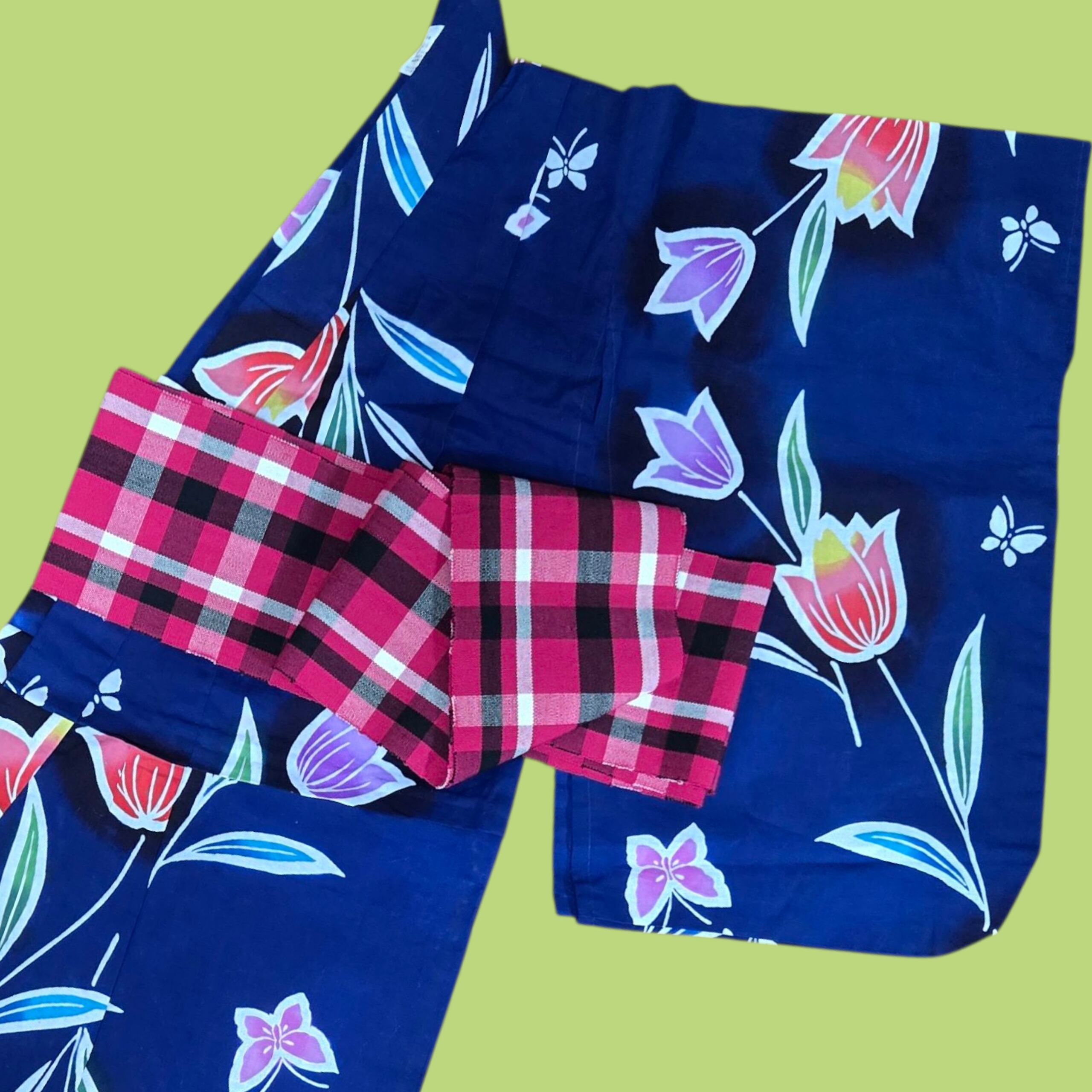 紺地にチューリップや蝶々柄がかわいいレトロな女児浴衣にチェックの半幅帯を合わせました。