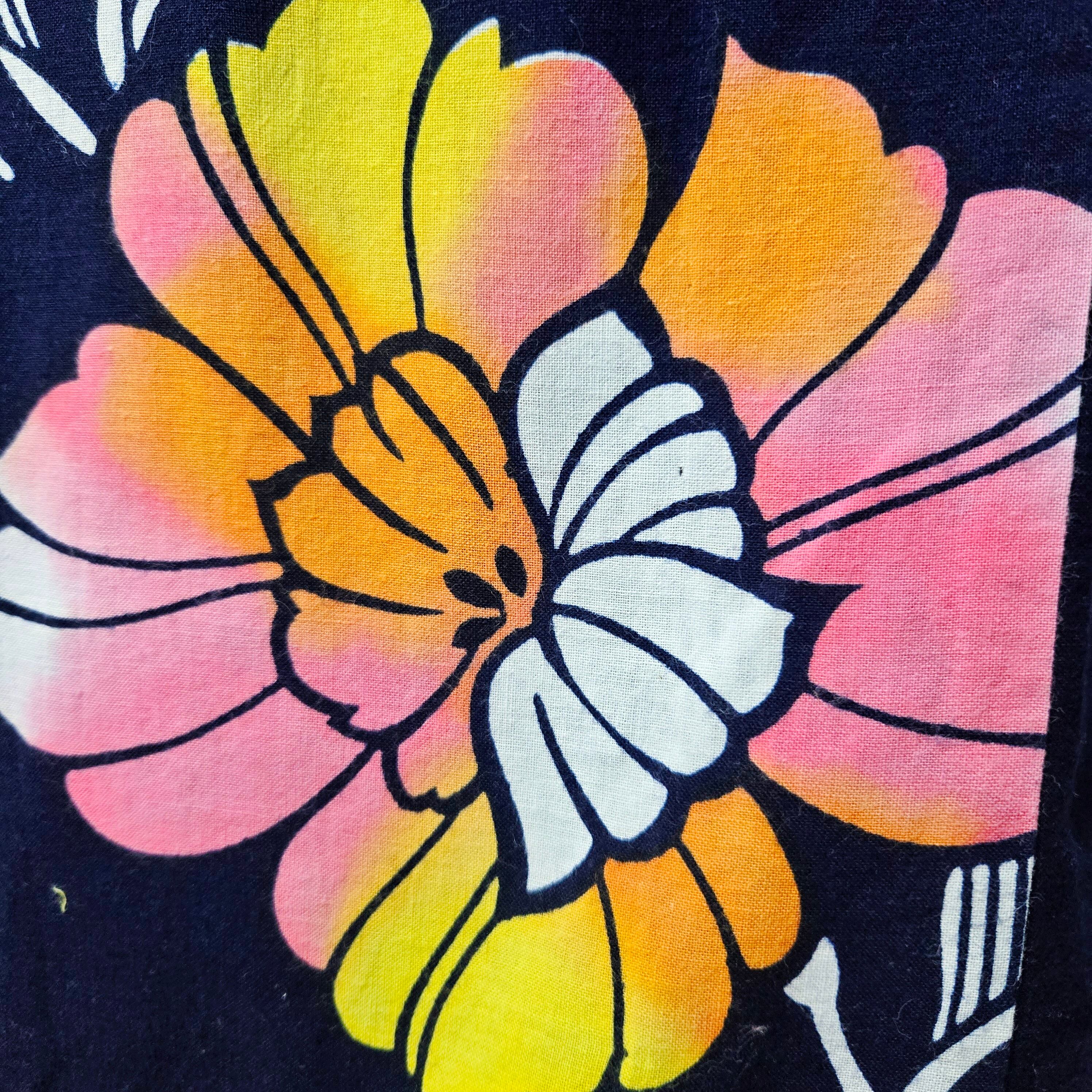 紺地に色とりどりのお花が描かれたレトロな注染浴衣と真っ赤な博多献上柄の半幅帯のセットです。