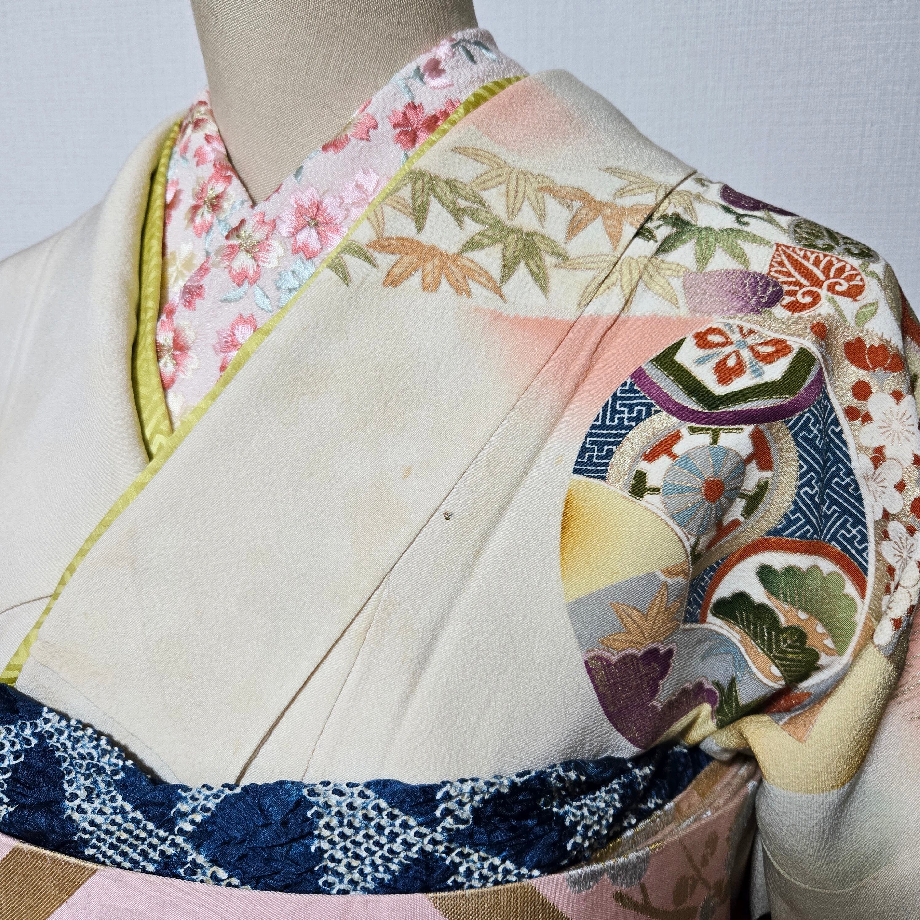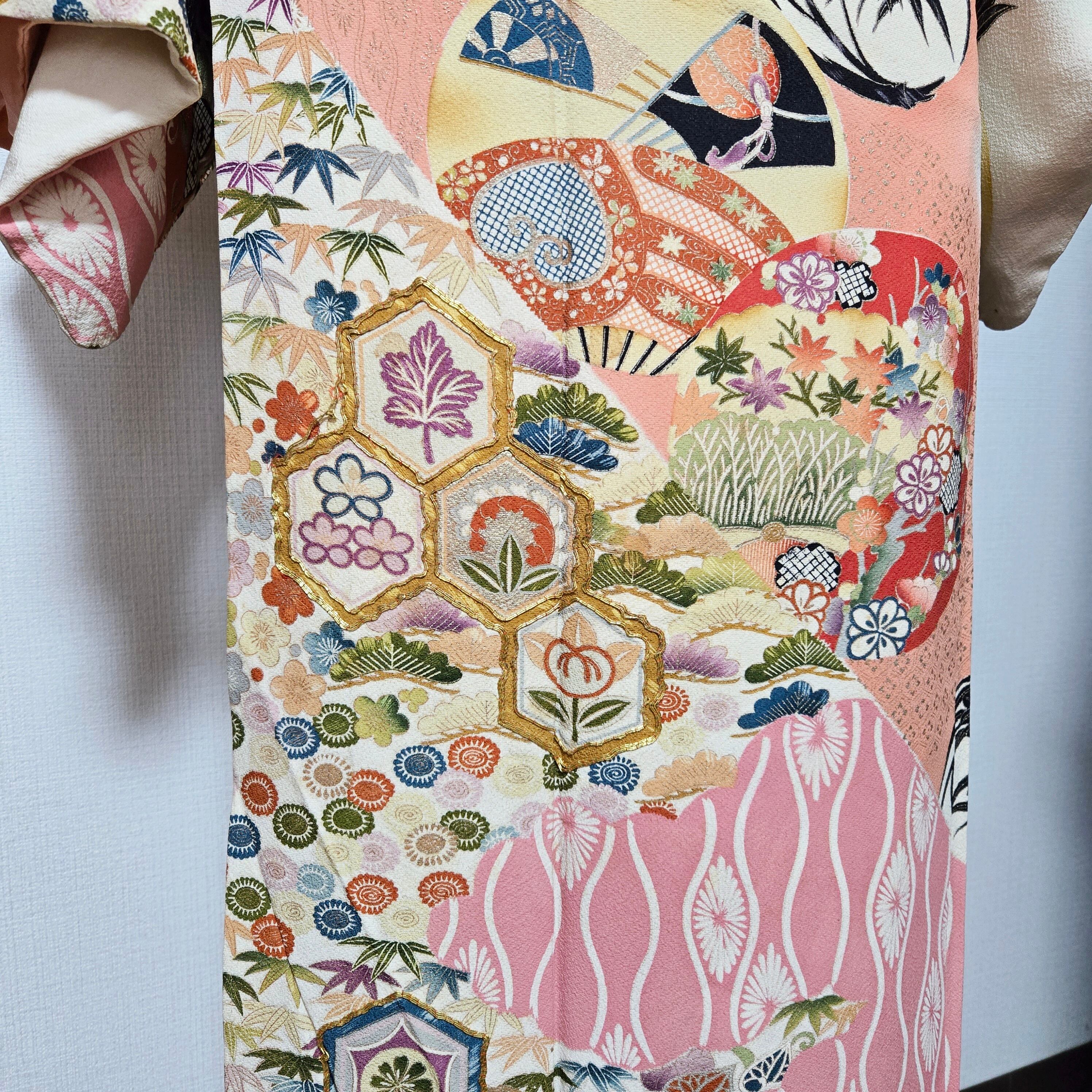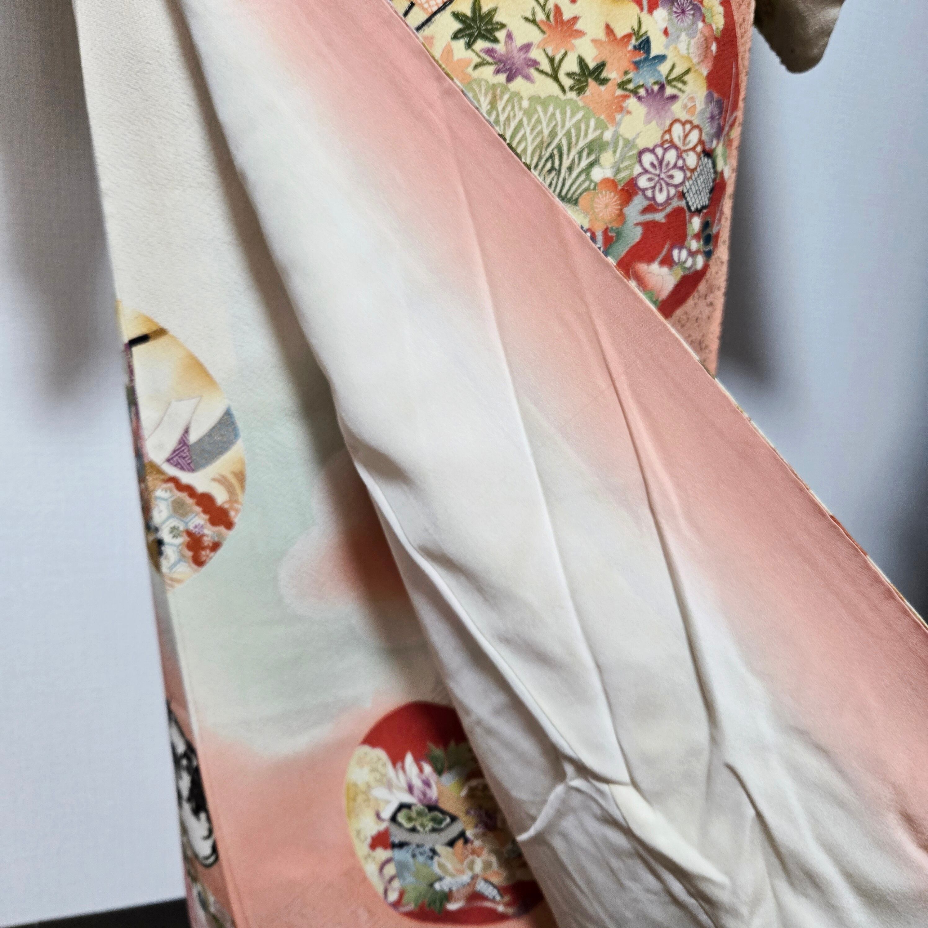 着物は振袖の袖を切ったものです。訪問着ではありませんが、絵羽柄になっており、とても華やかなので、お正月やおめかししたいときにおすすめです。