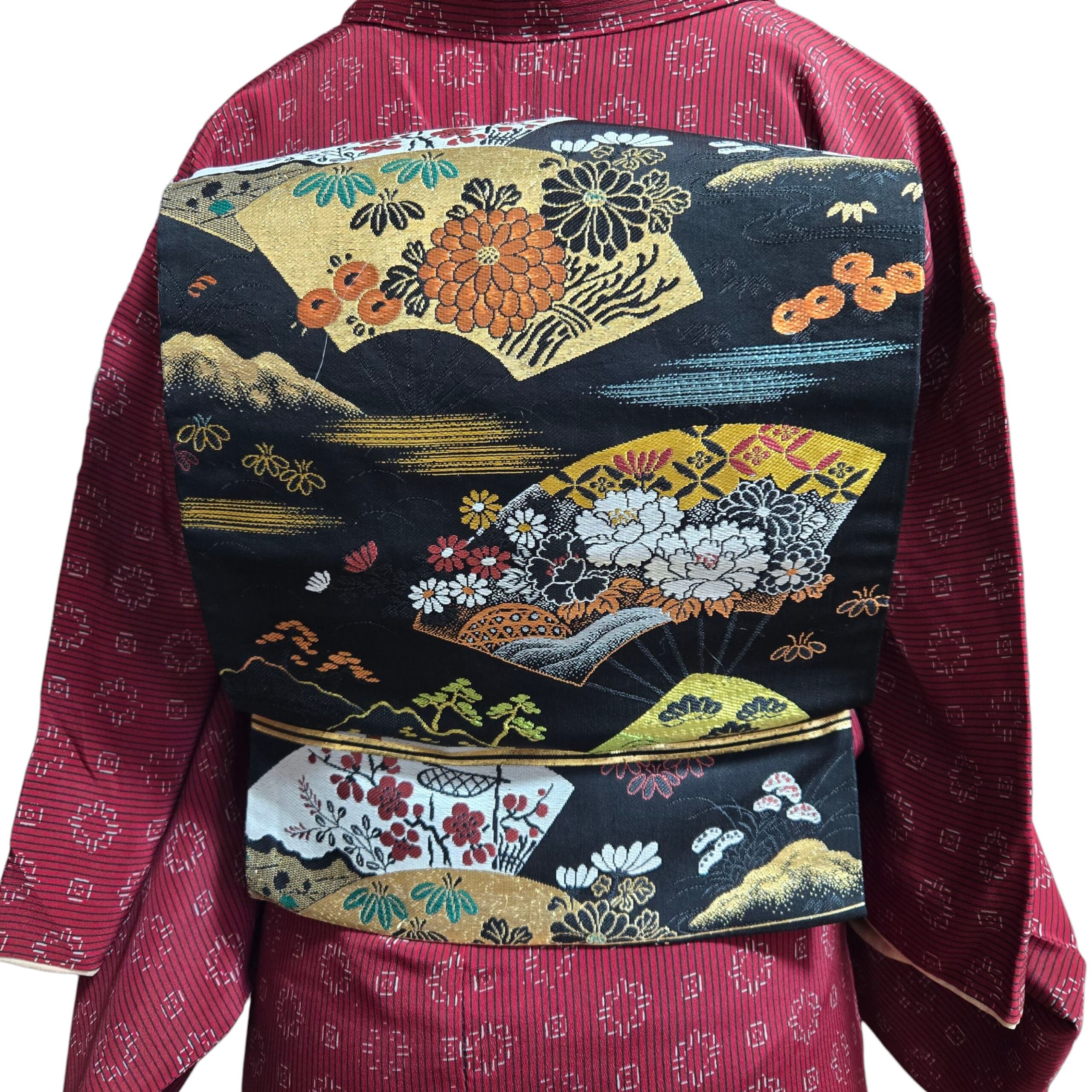 黒地の花扇が織り込まれた豪華なアンティーク名古屋帯を合わせました。