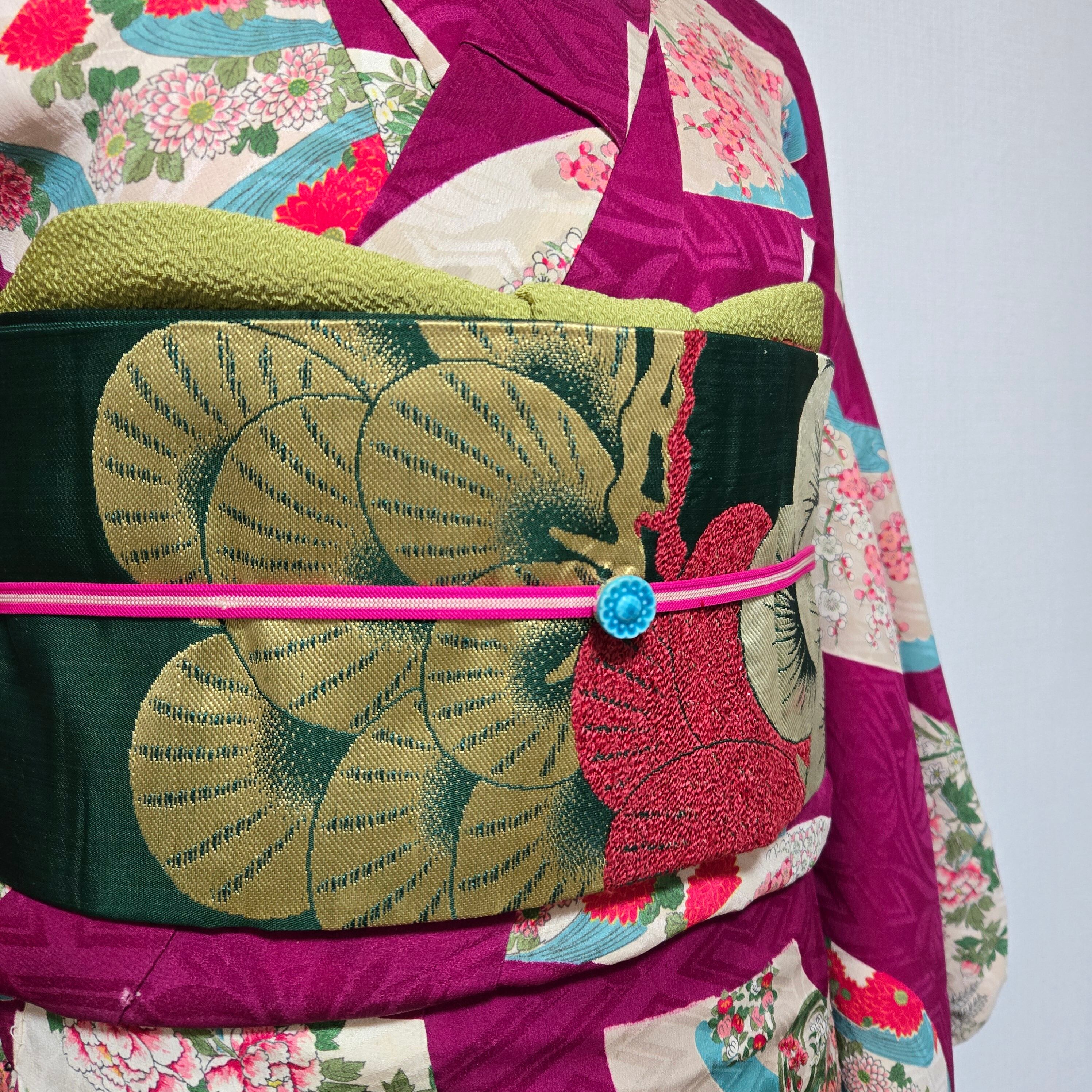 華かやなアンティークならではの色柄の袖丈長めの小紋に大胆な松が描かれた深緑地のアンティーク名古屋帯を合わせました。