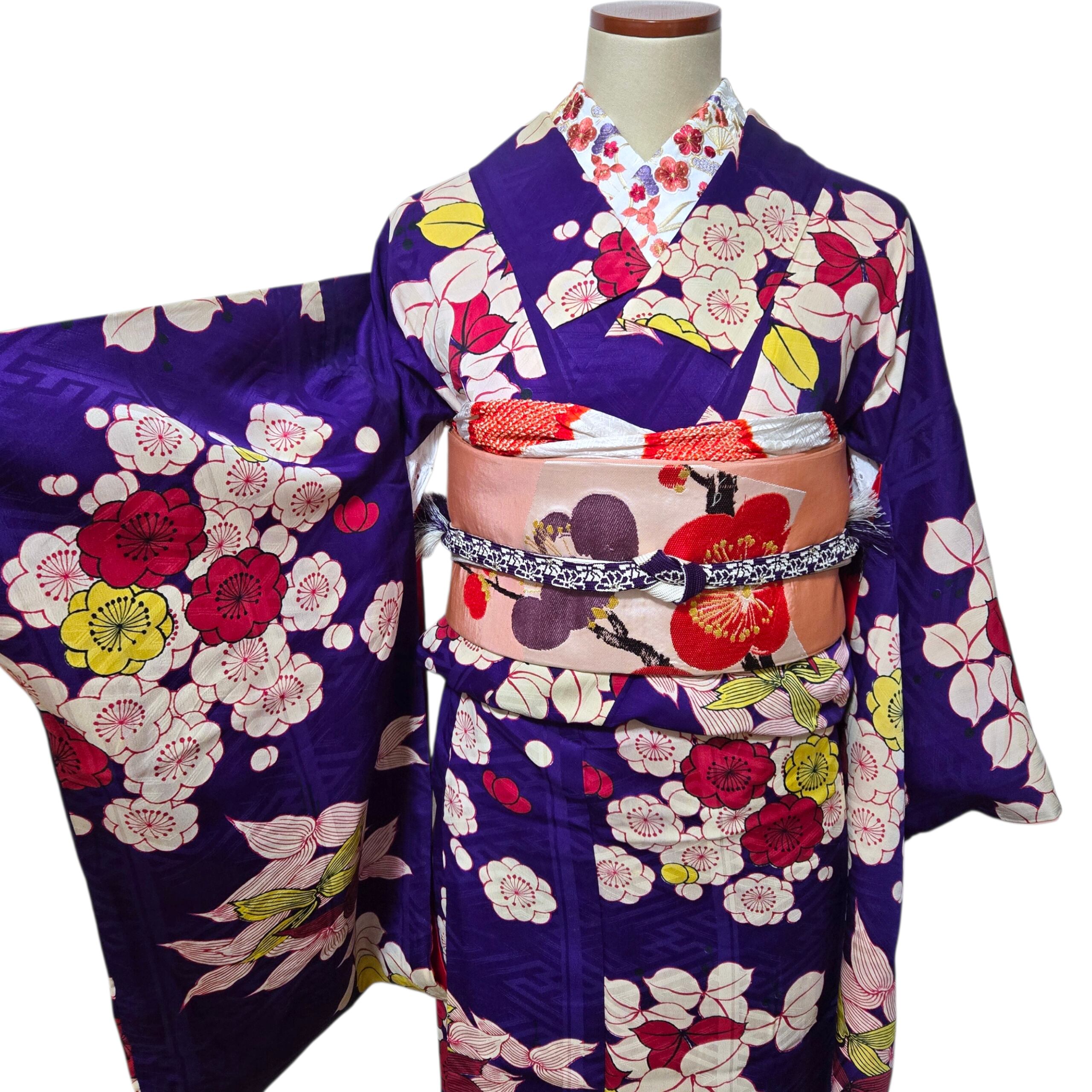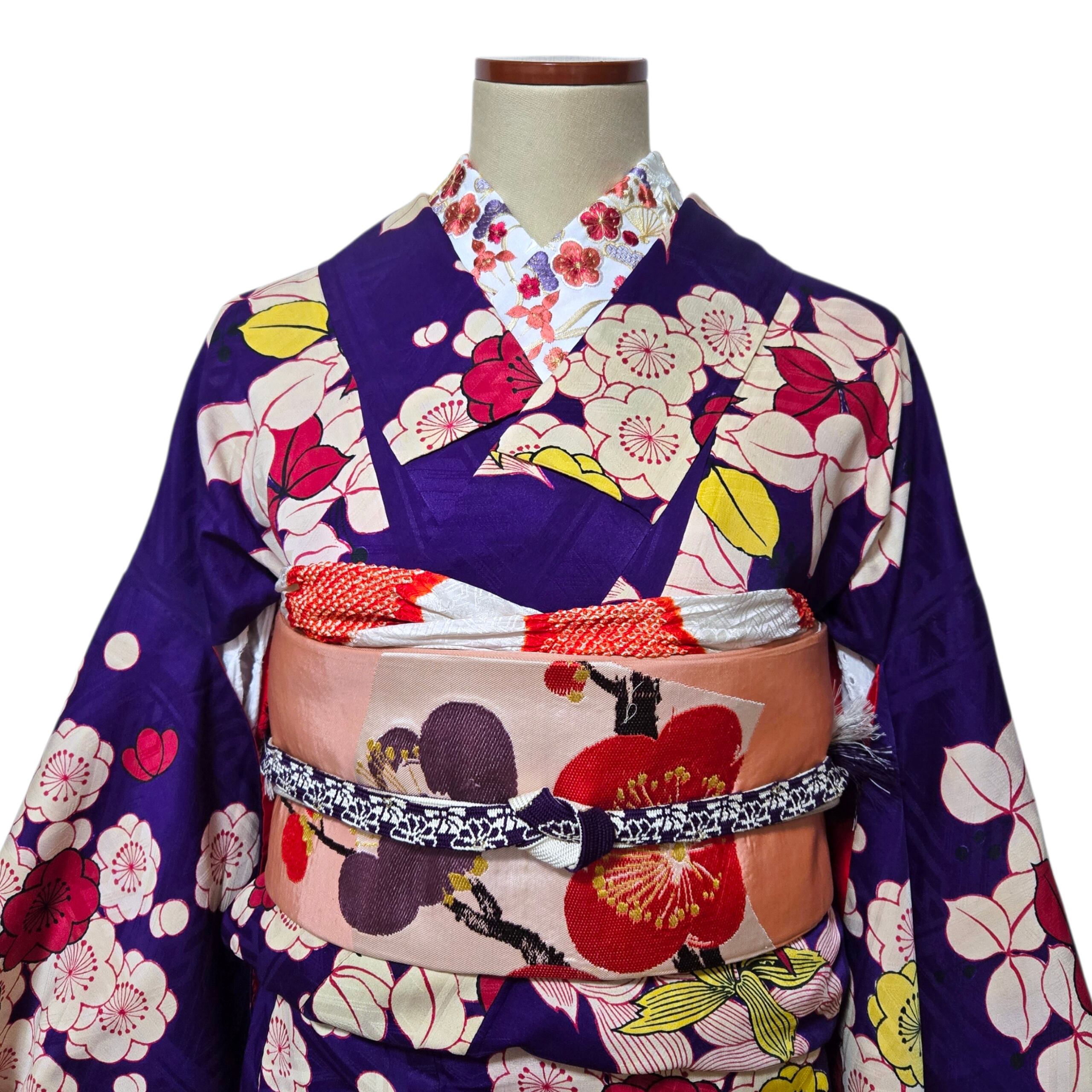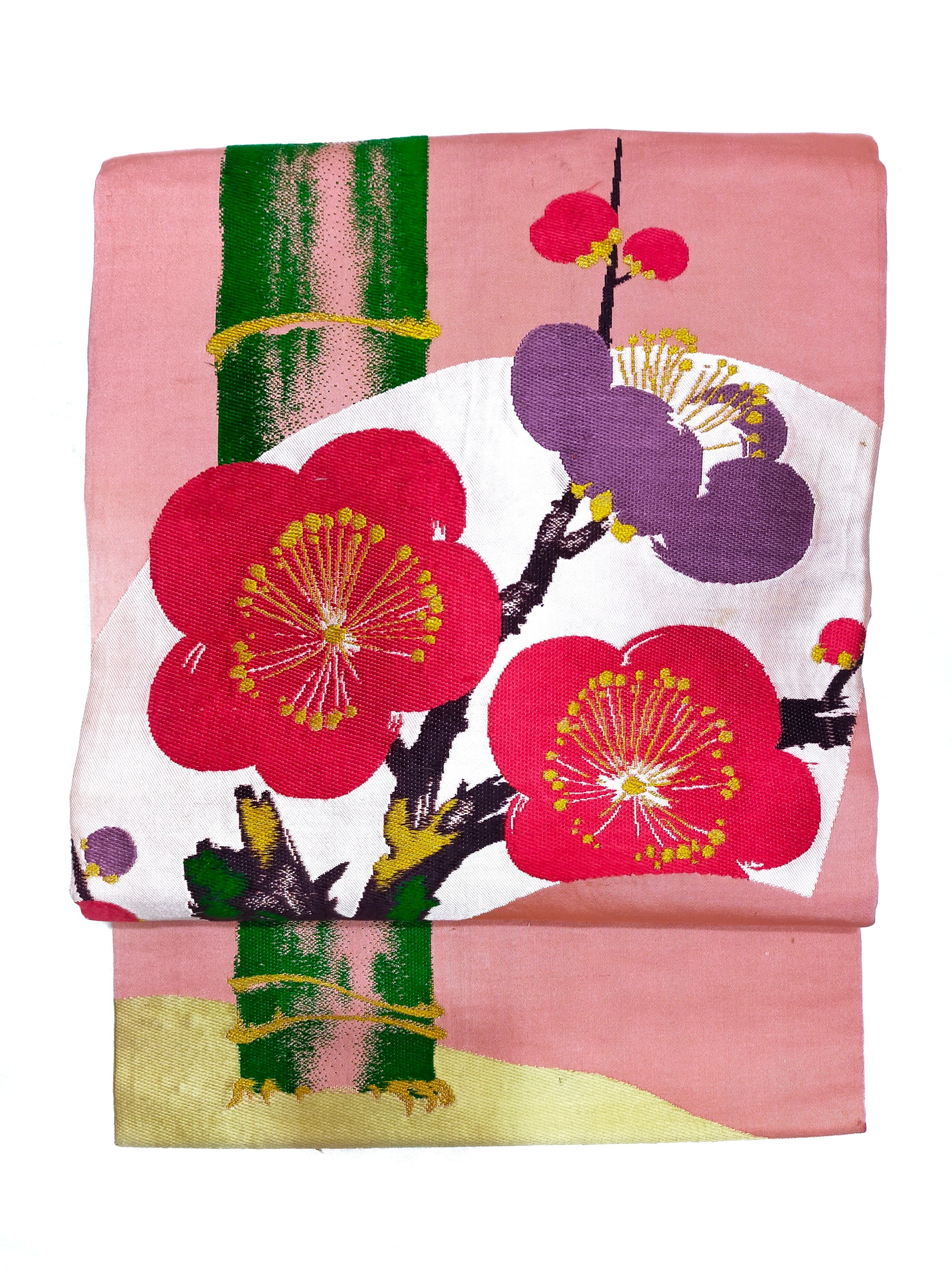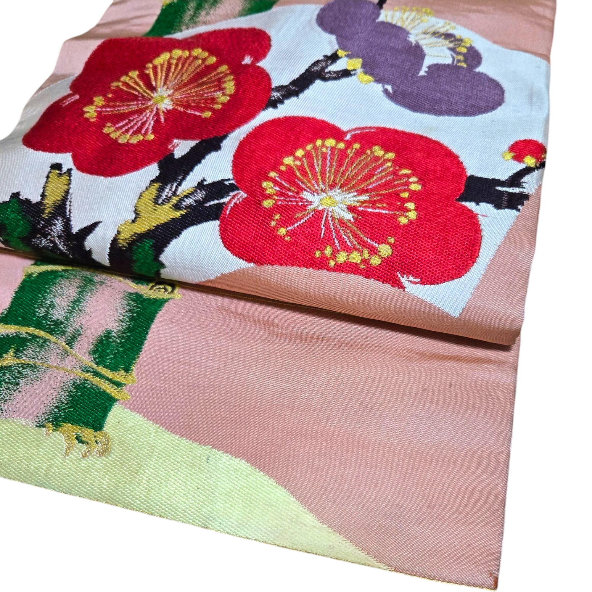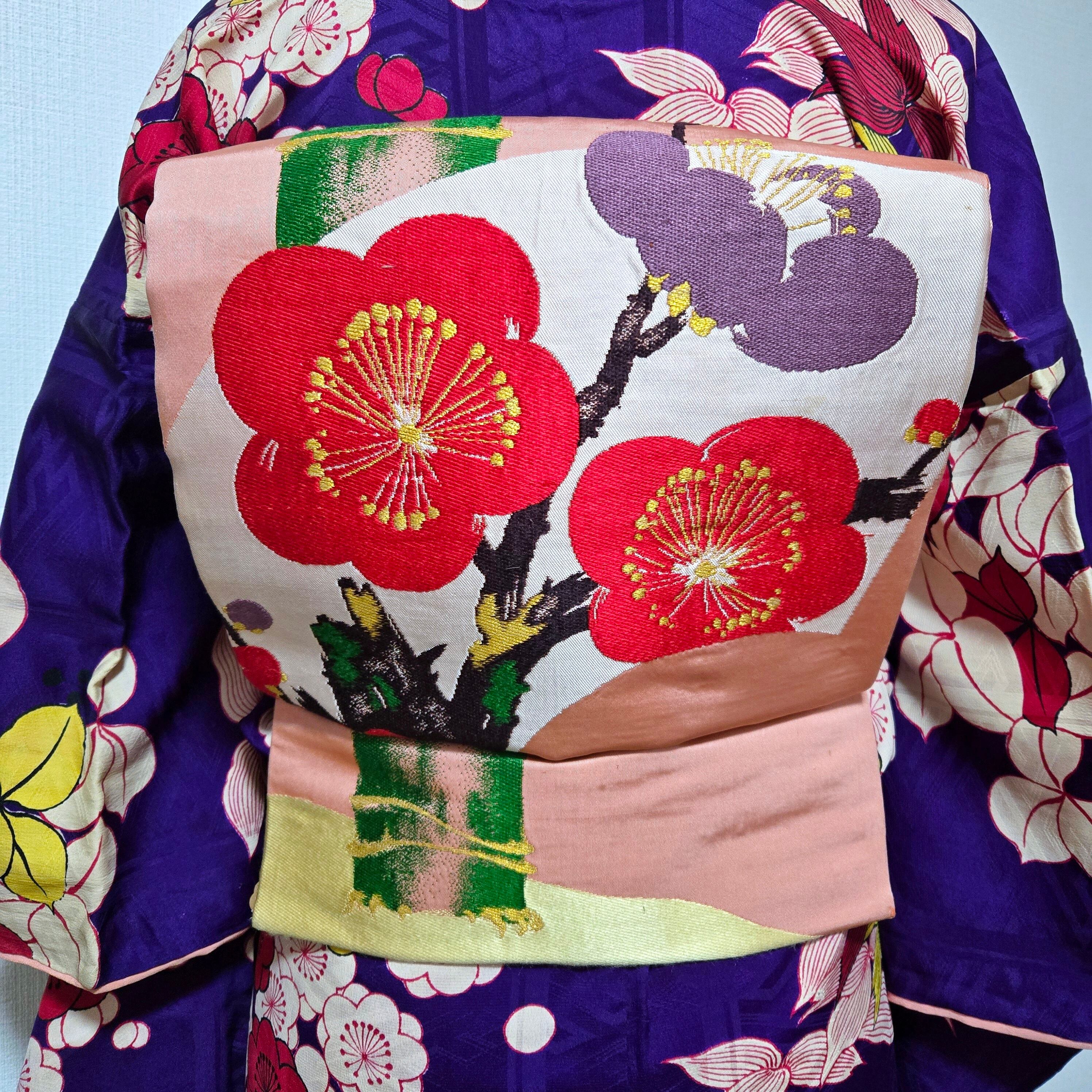 梅柄のレトロなアンティーク着物に梅と竹が大きく描かれたおめでたいアンティーク名古屋帯を合わせました。