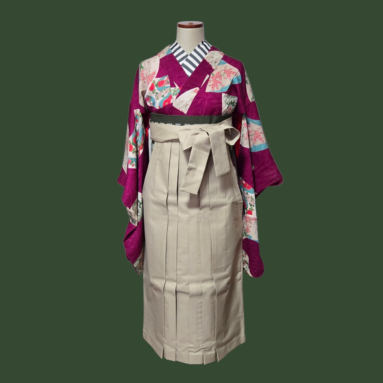 華かやなアンティークならではの色柄の袖丈長めの小紋にベージュの袴を合わせました。