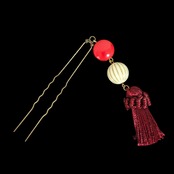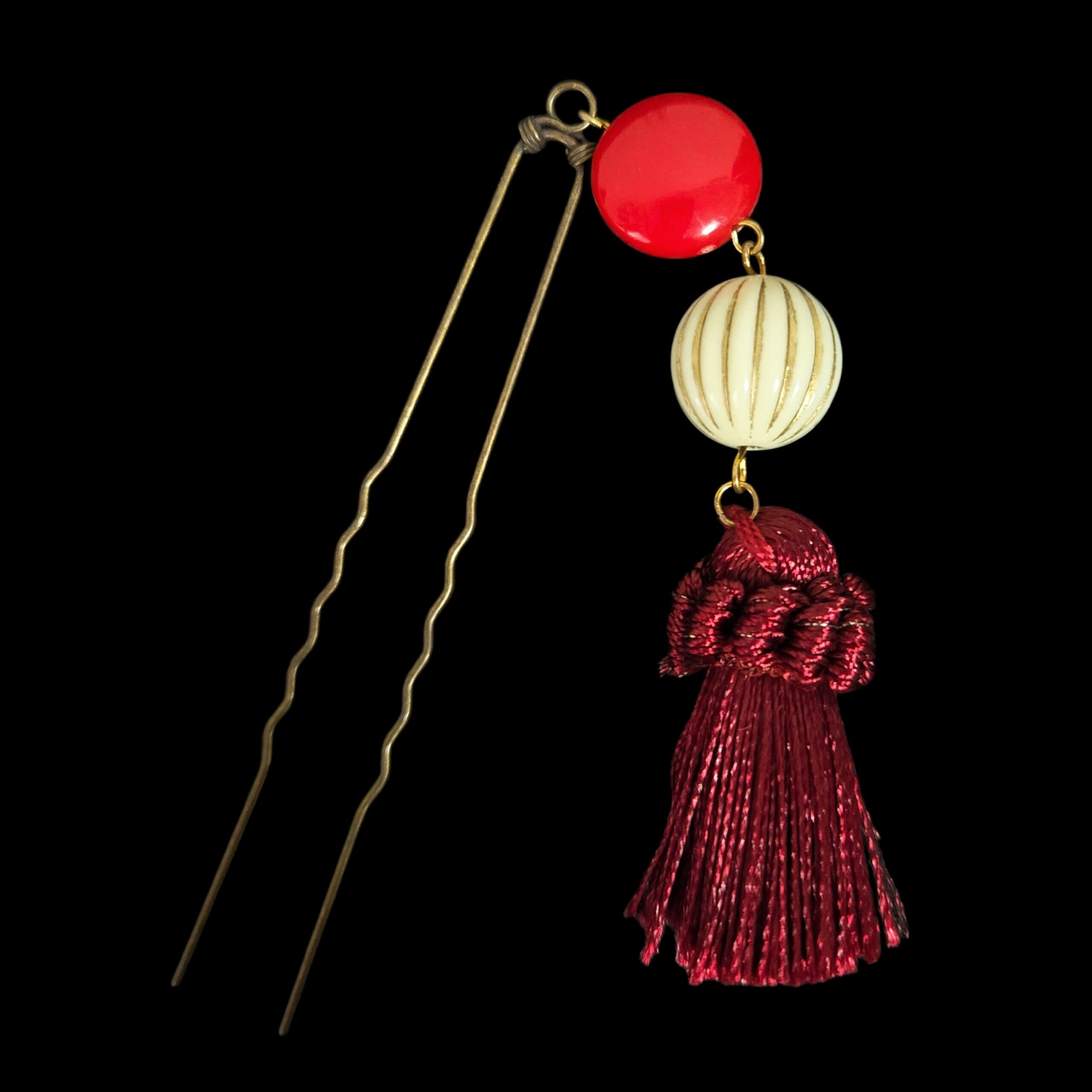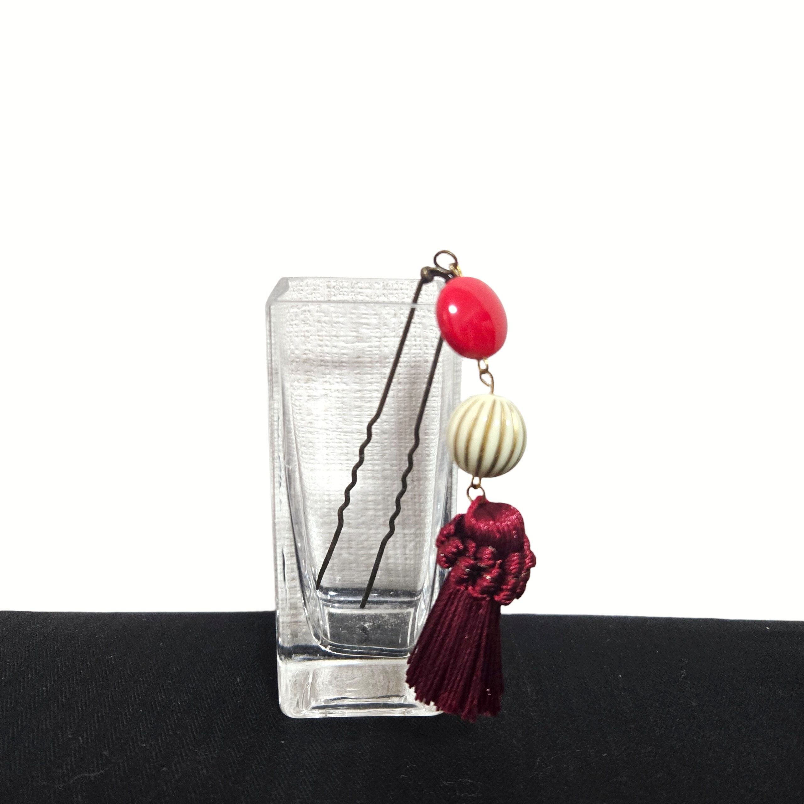 紅白のビーズとタッセルがかわいいレトロなかんざし。
