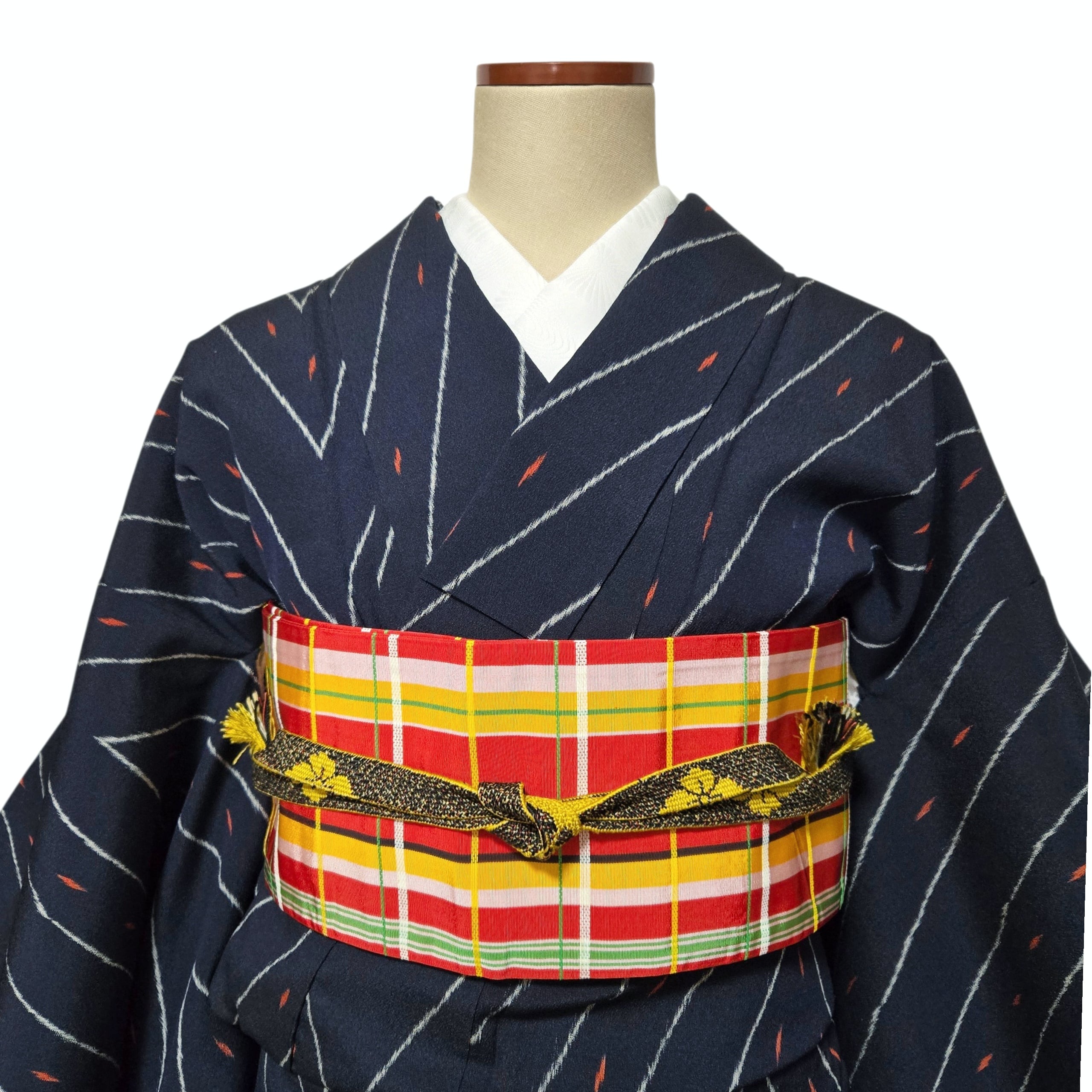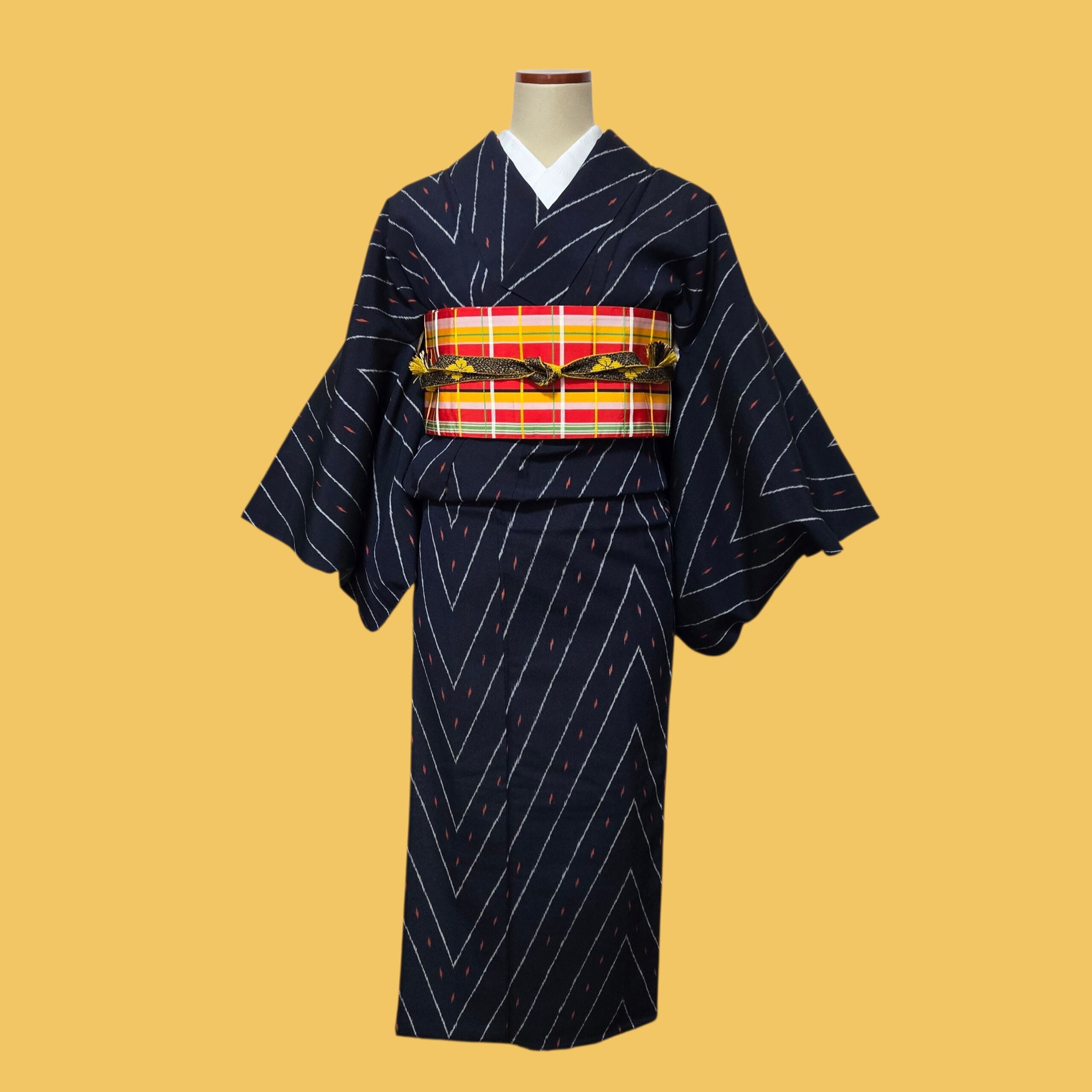 絣模様の単衣着物に鮮やかなチェック柄半幅帯を合わせました。