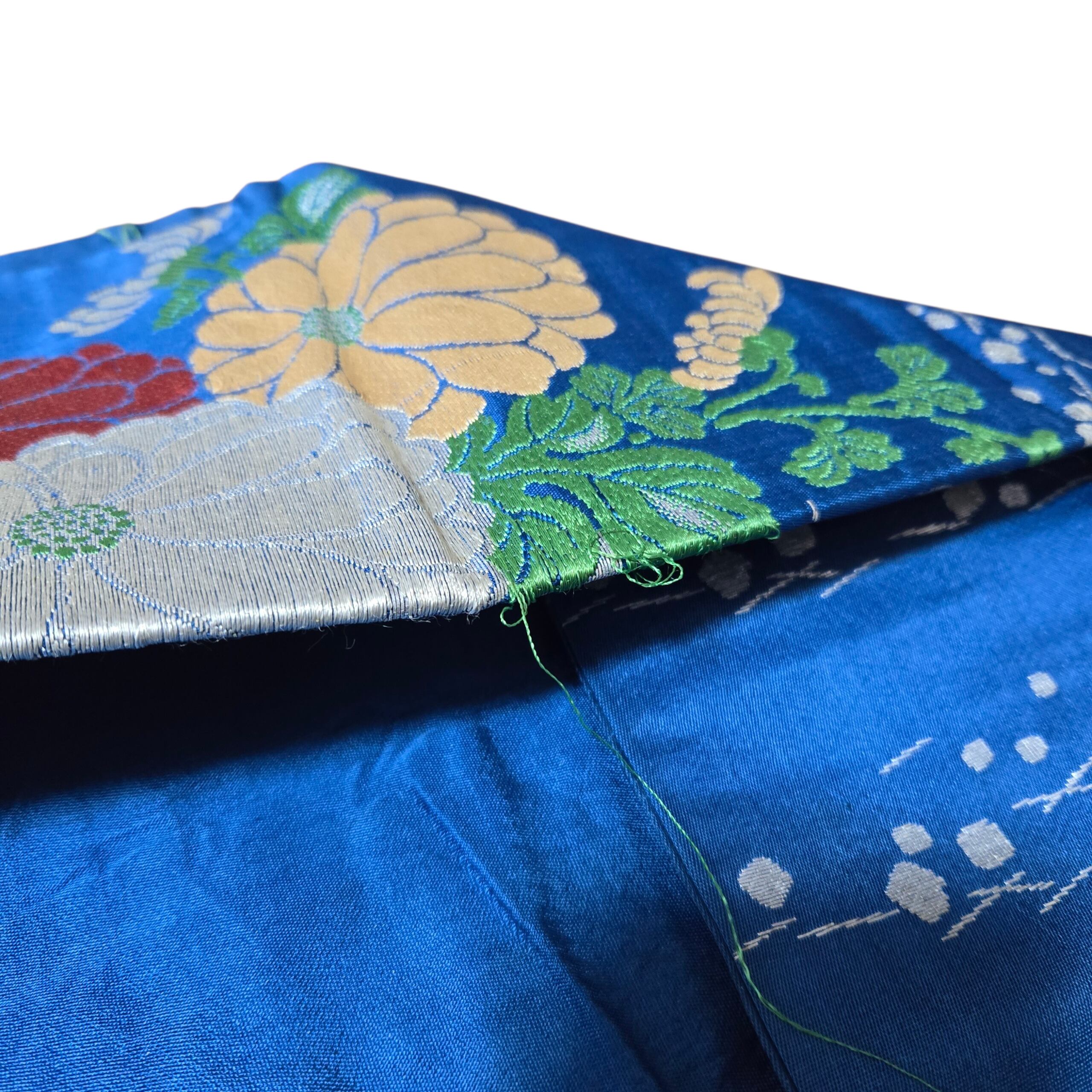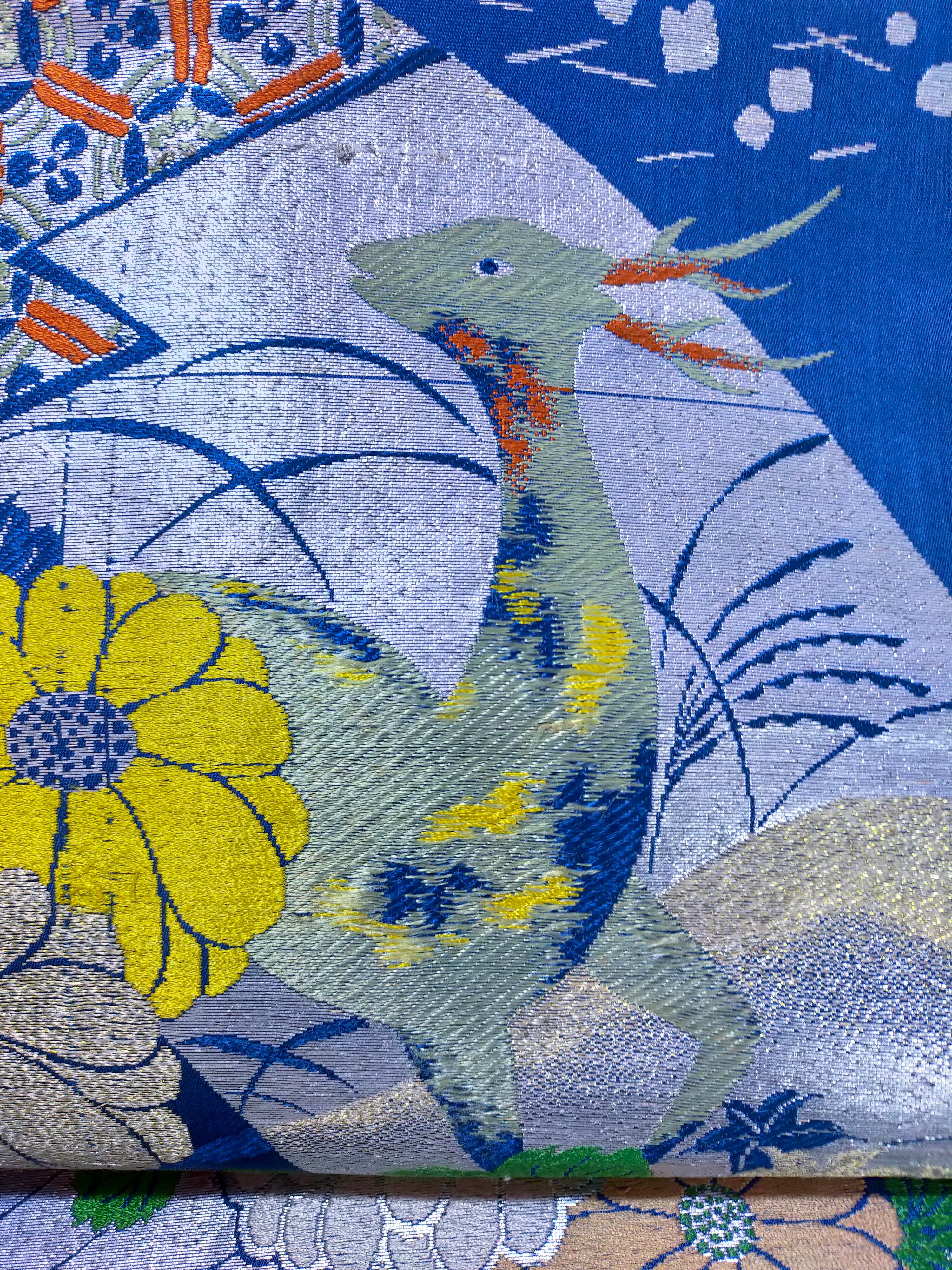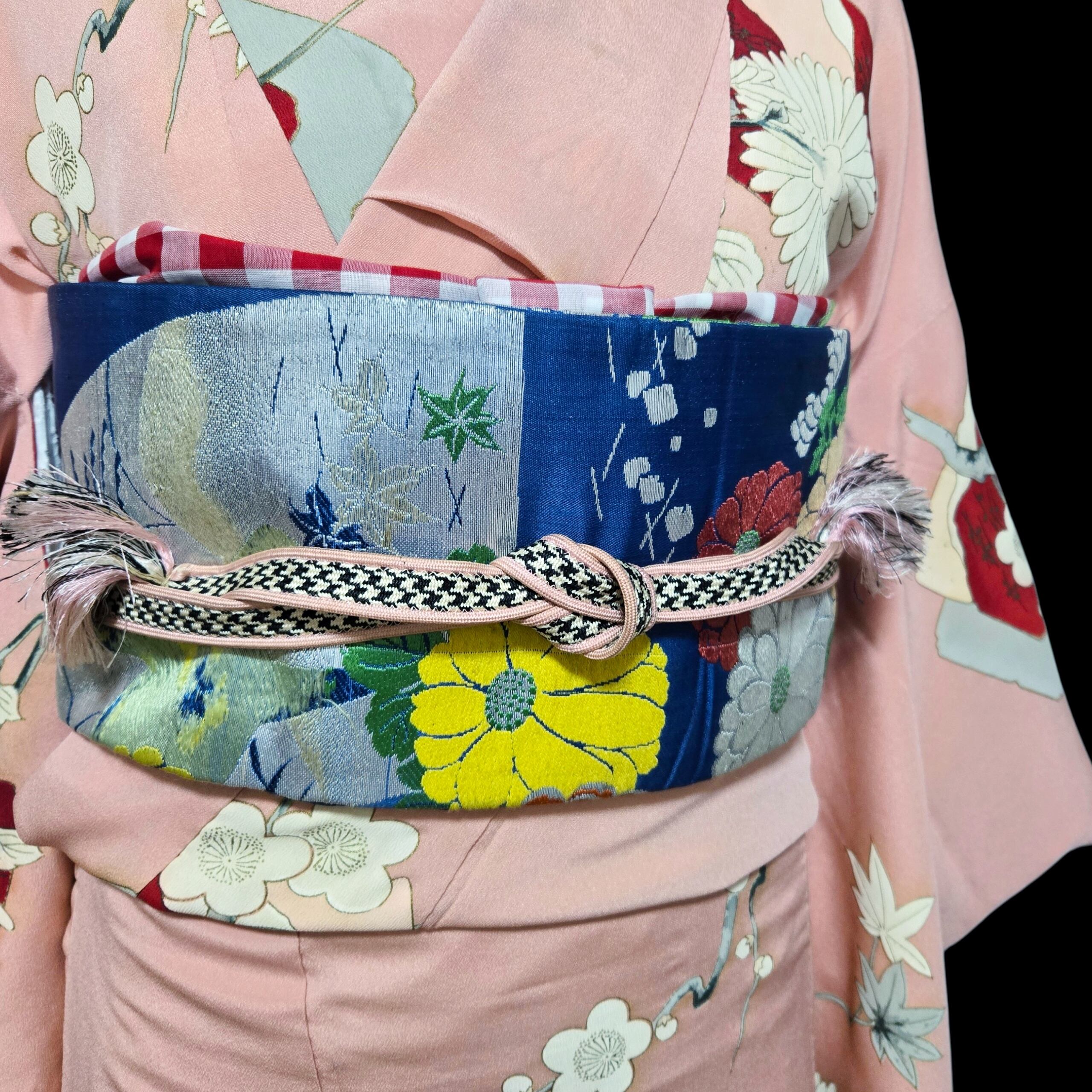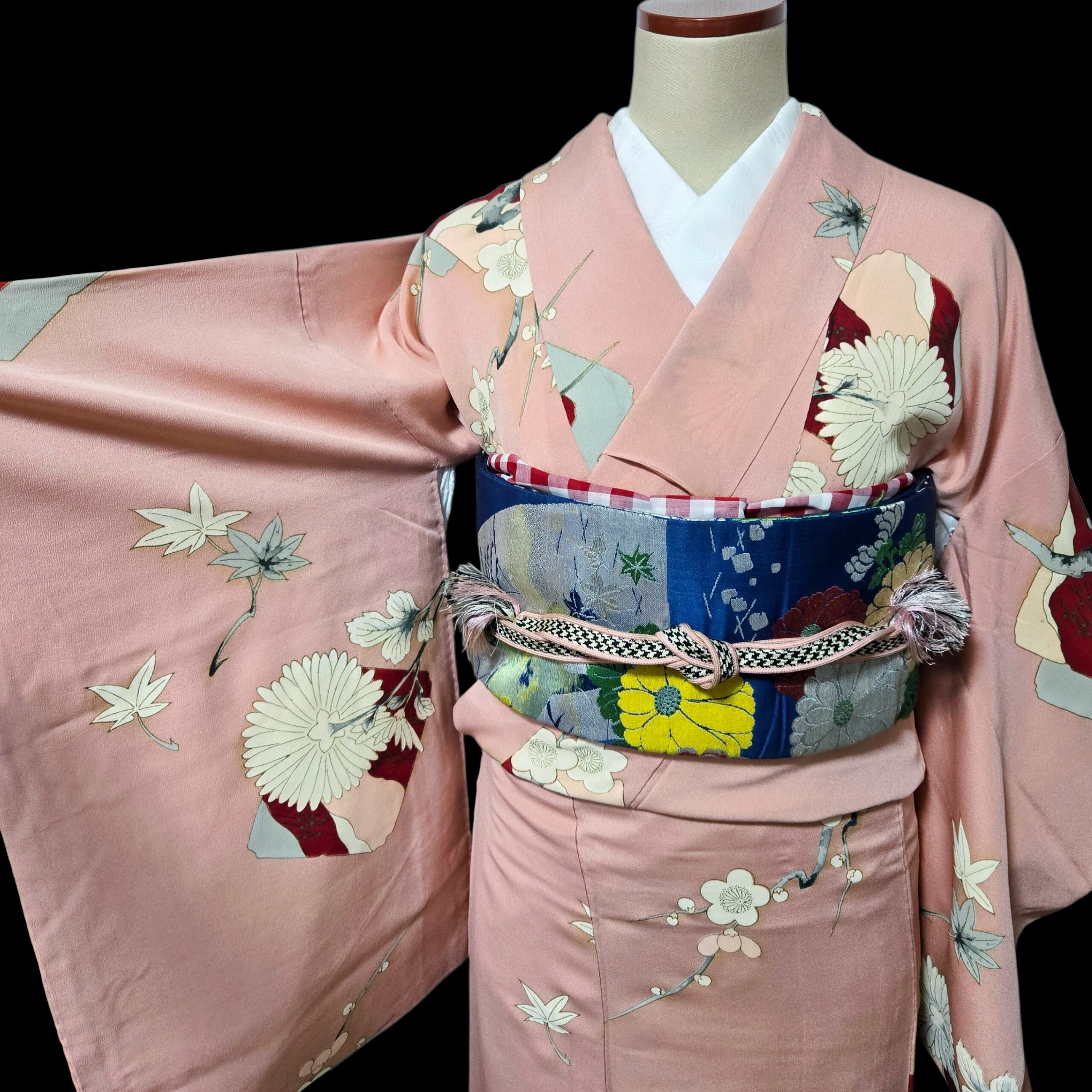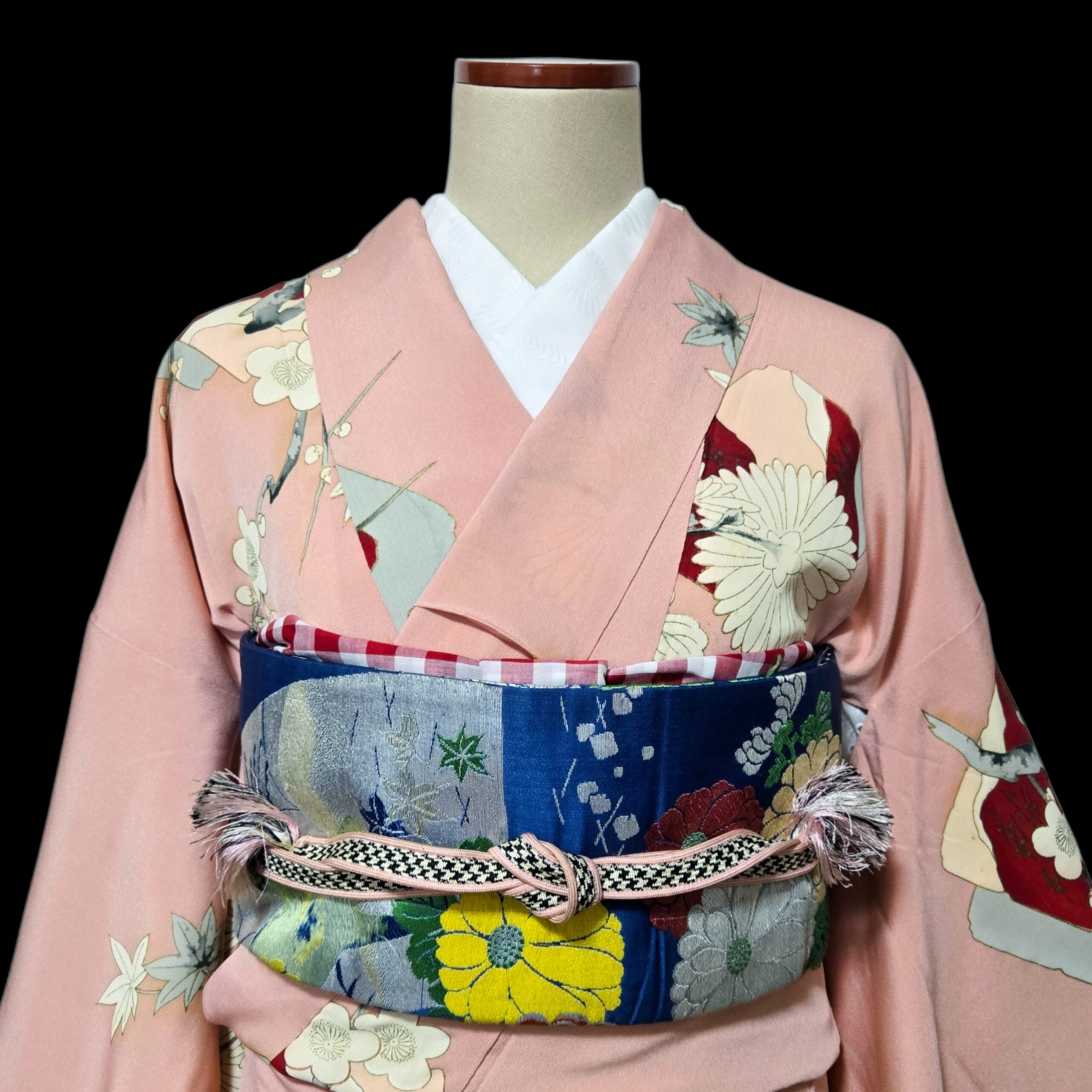 ピンク色の可憐なアンティーク着物に華やかな菊や鹿が描かれたブルーのアンティーク名古屋帯を合わせました。