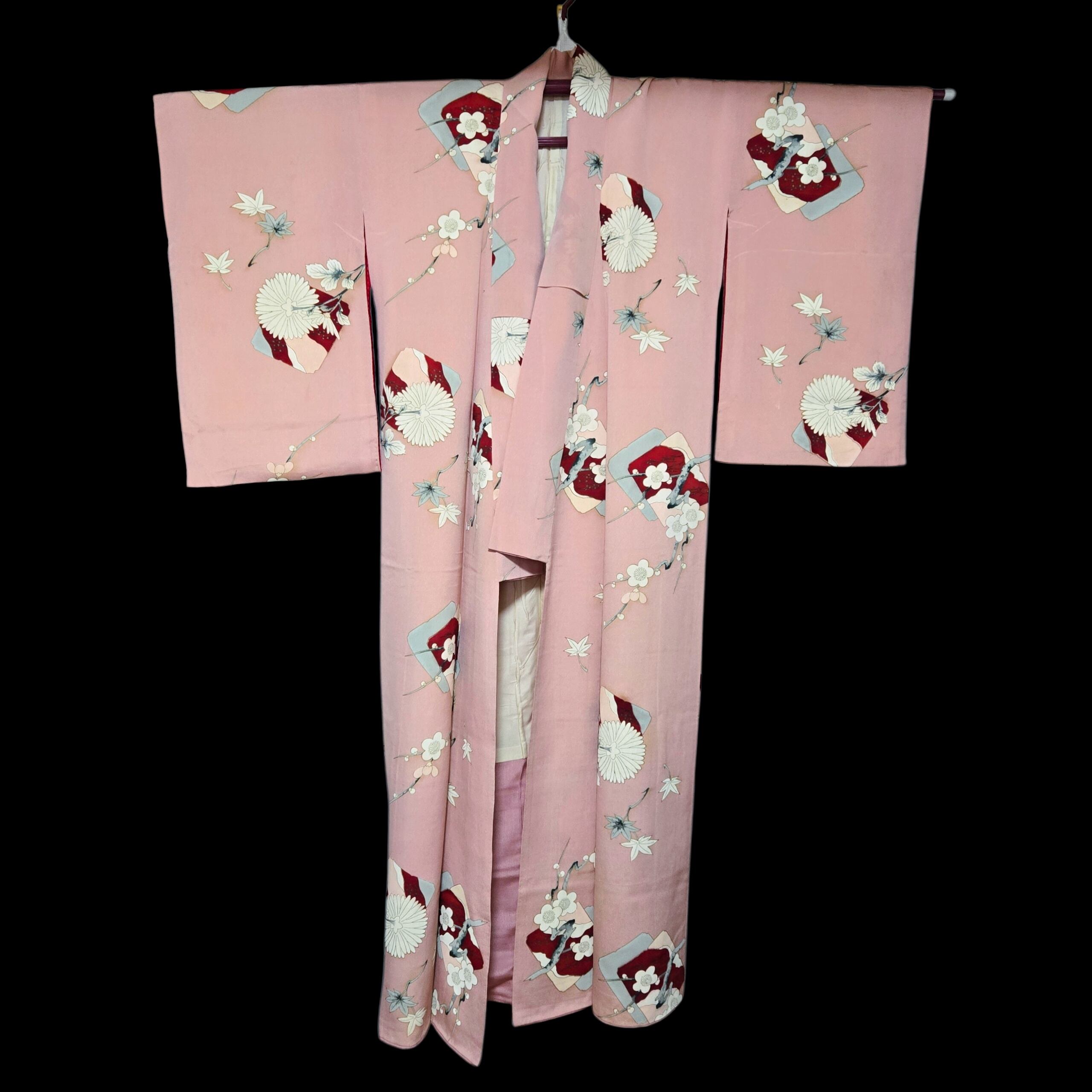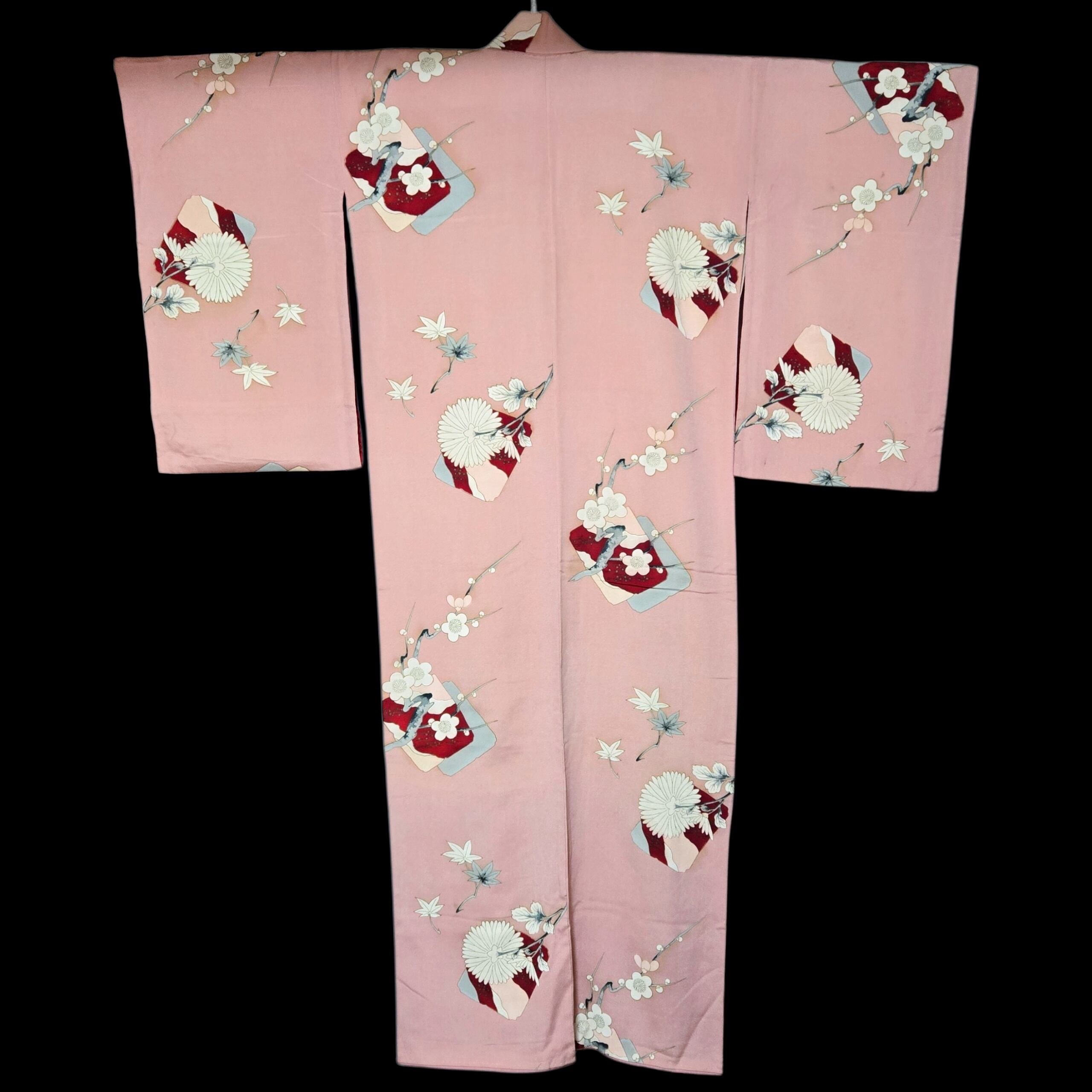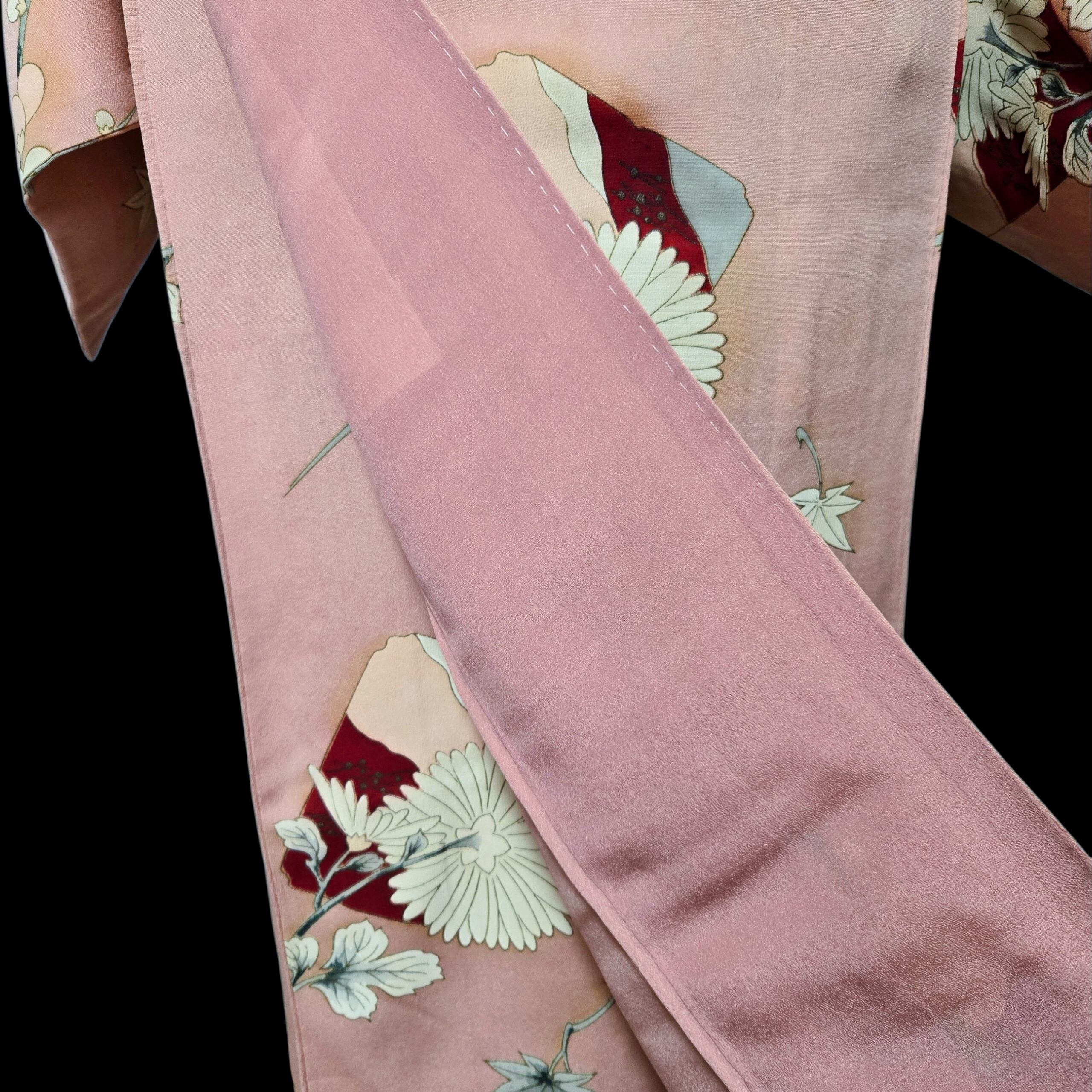 ピンク 菊 アンティーク着物 小紋 鹿 アンティーク名古屋帯