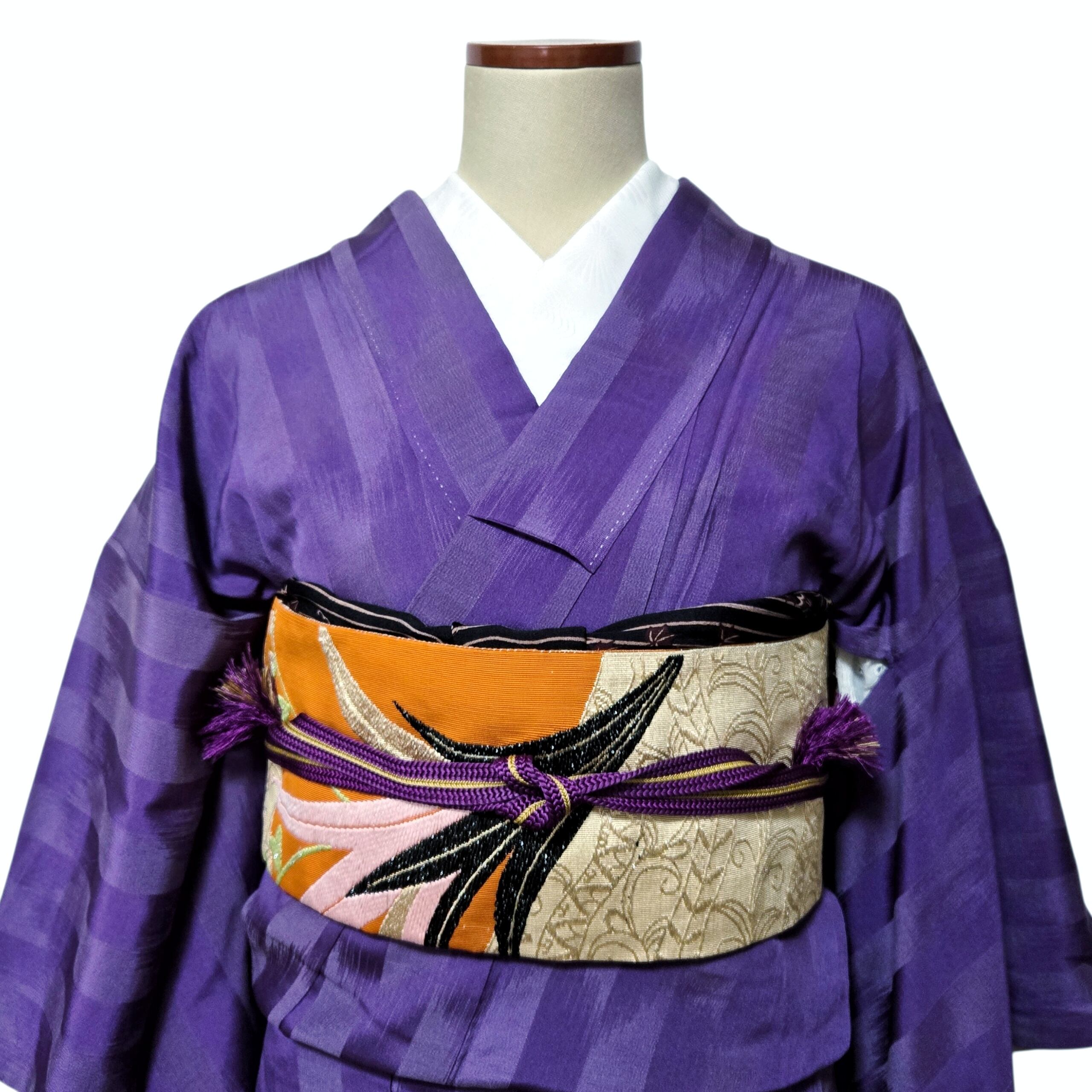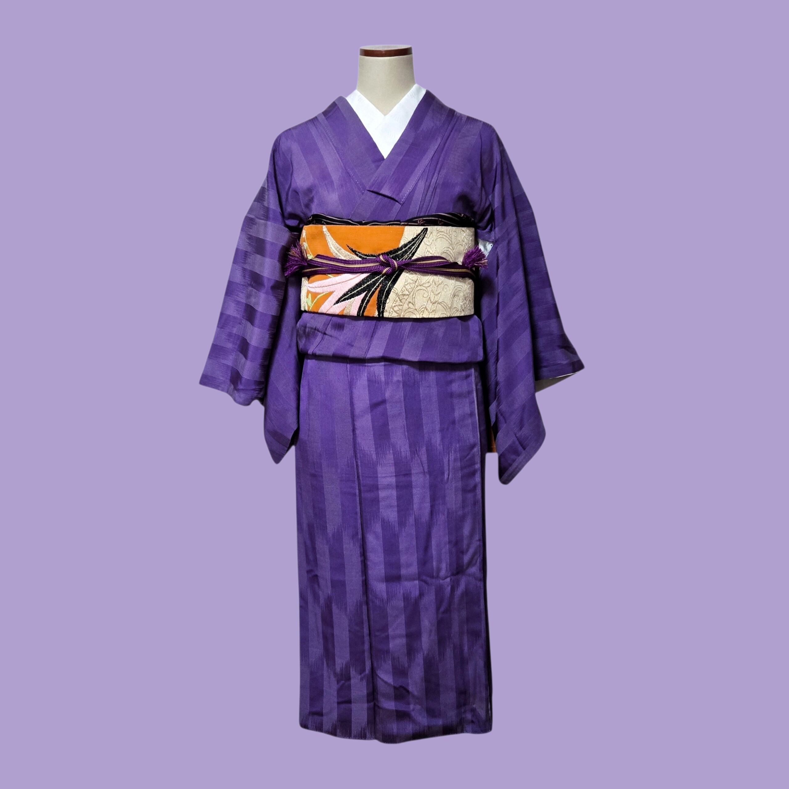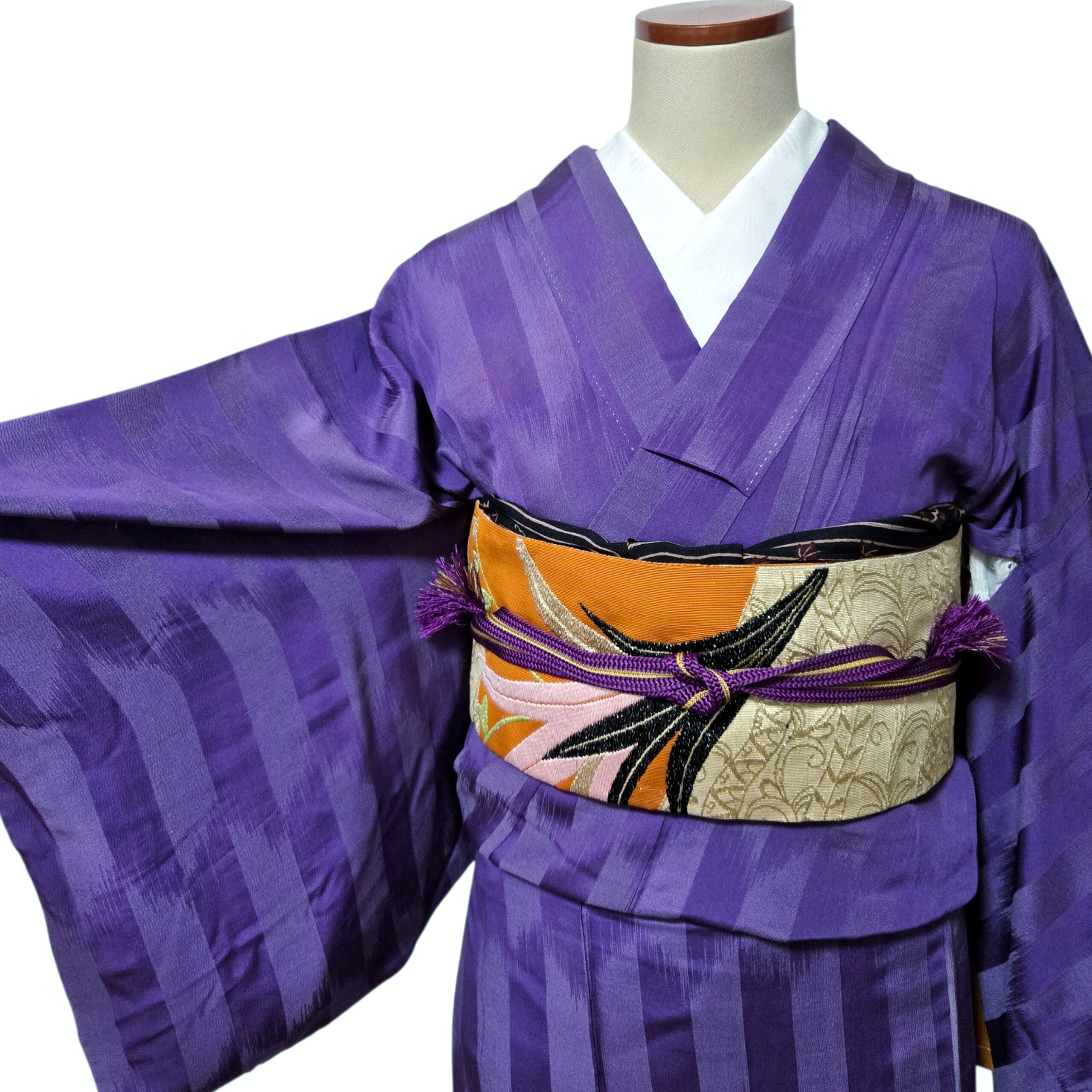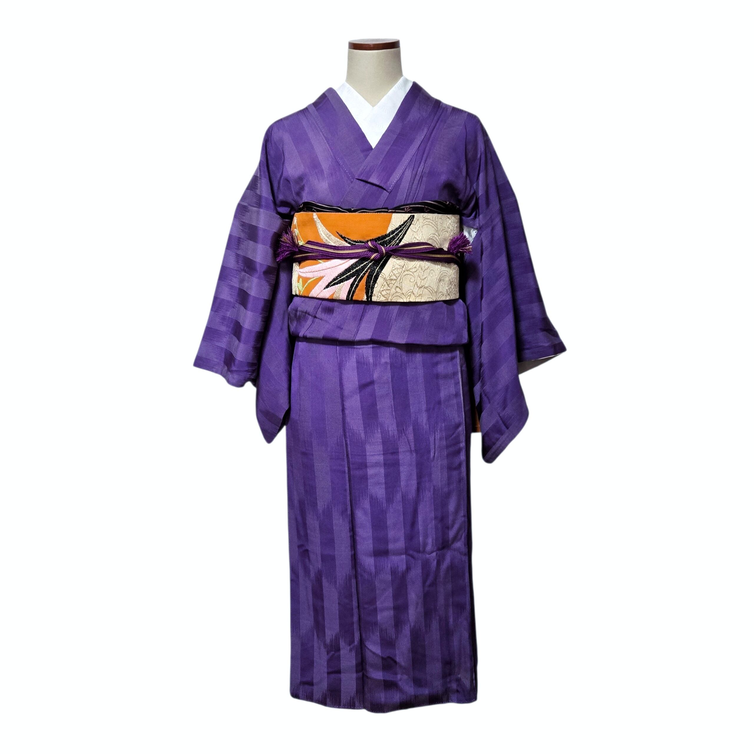 縞 無地 紫 アンティーク着物 名古屋帯