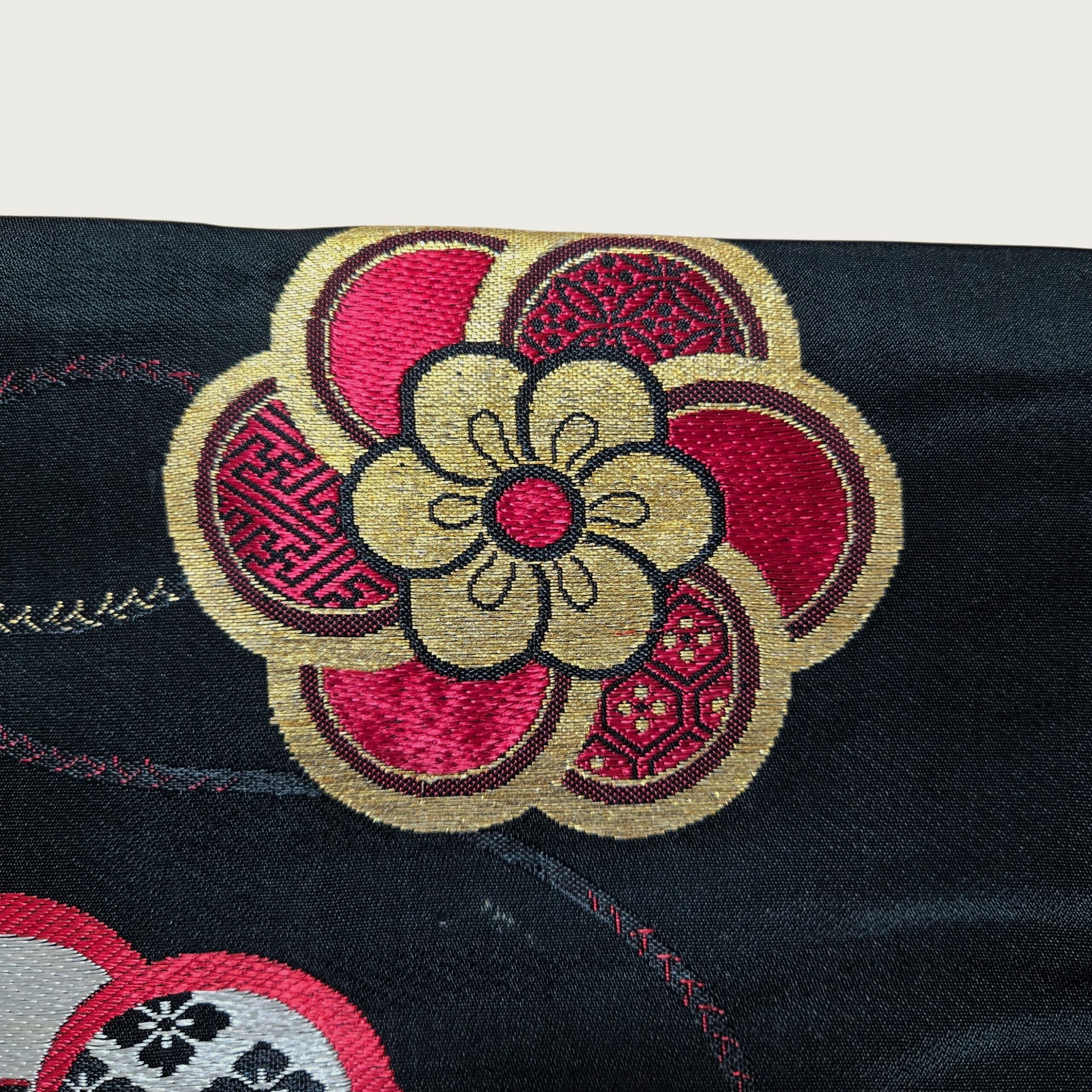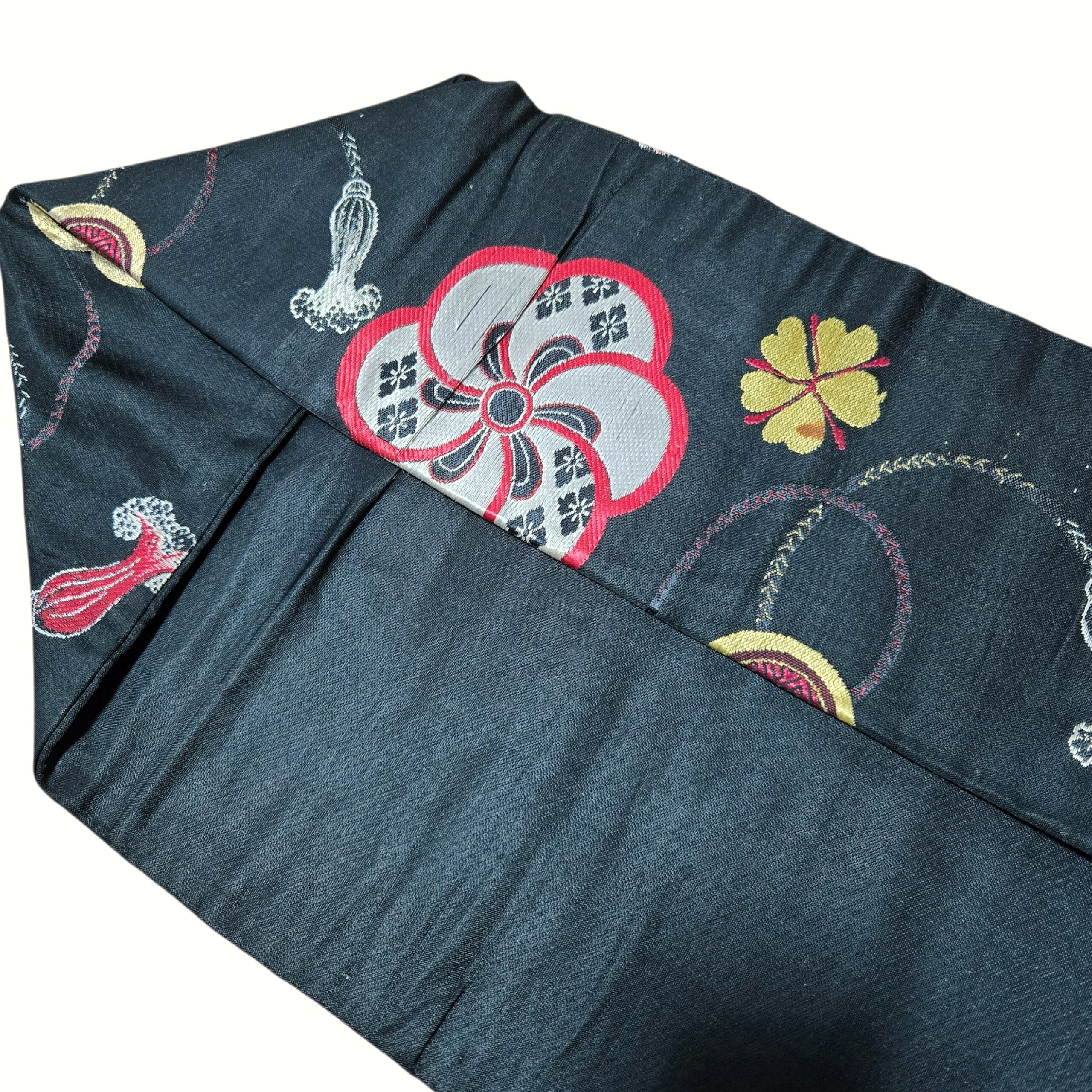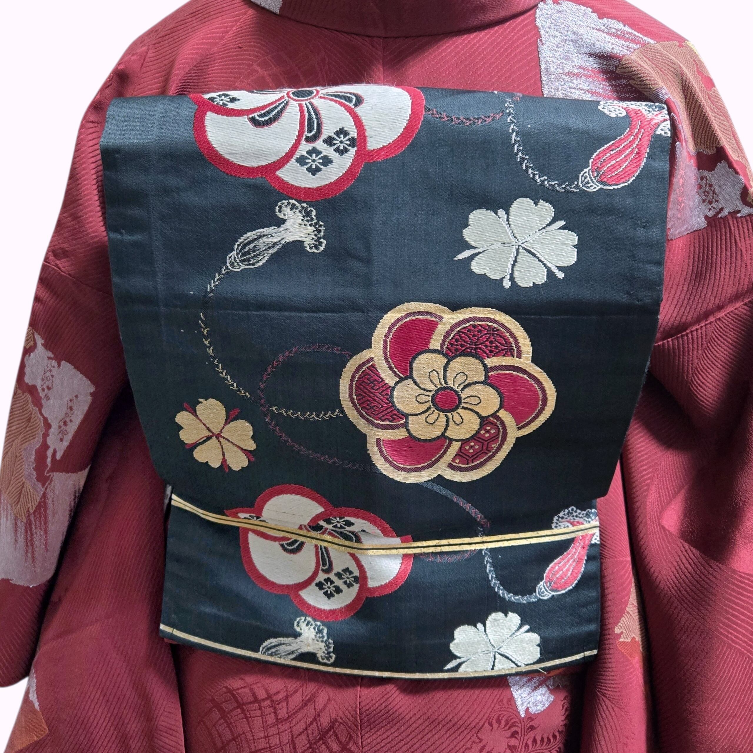 黒地の捻り梅が織り込まれたレトロなアンティーク名古屋帯。