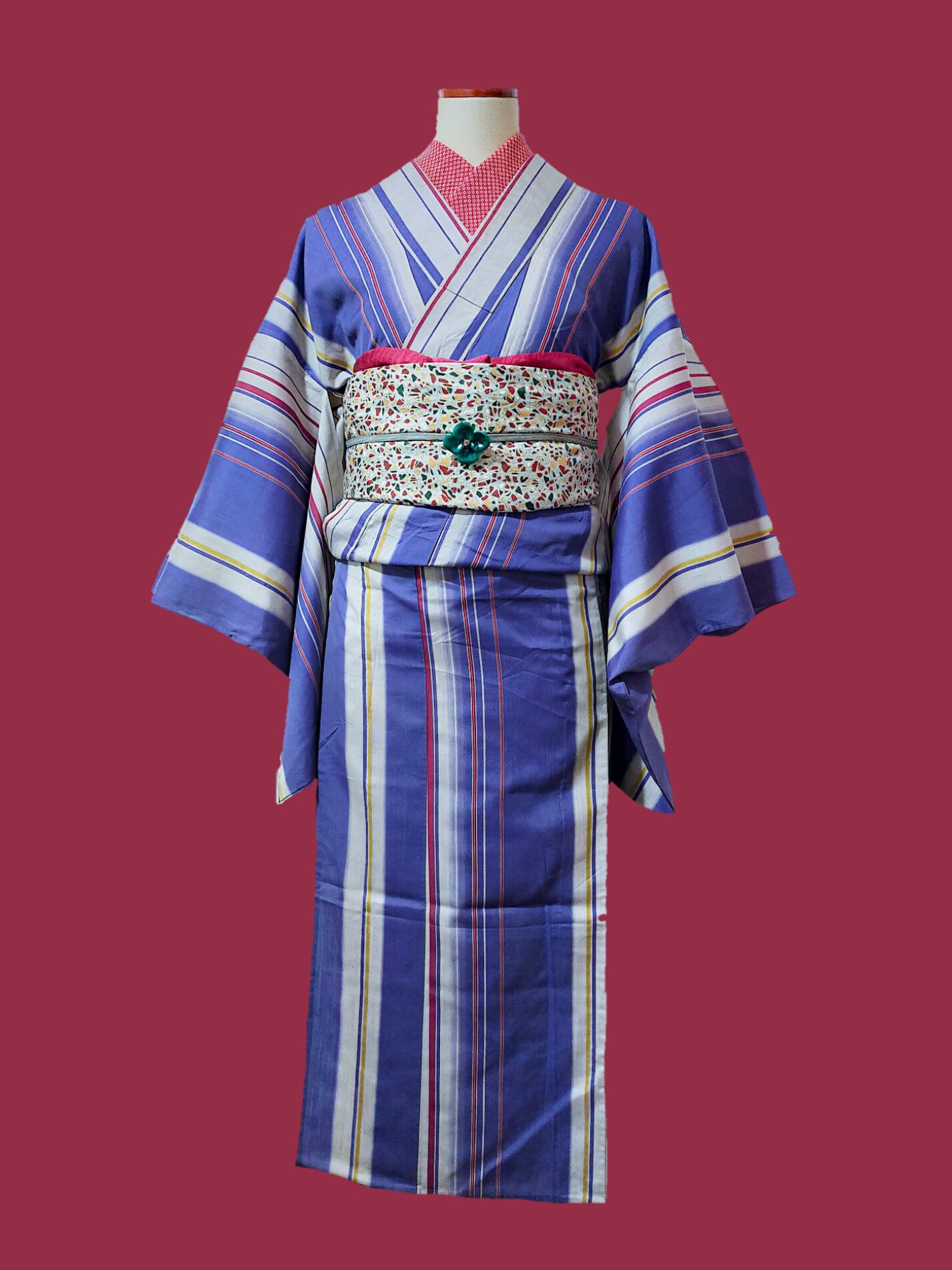 涼し気なブルー地にえんじや山吹色の縞がとても綺麗なアンティーク単衣着物にモダンな染帯を合わせました。