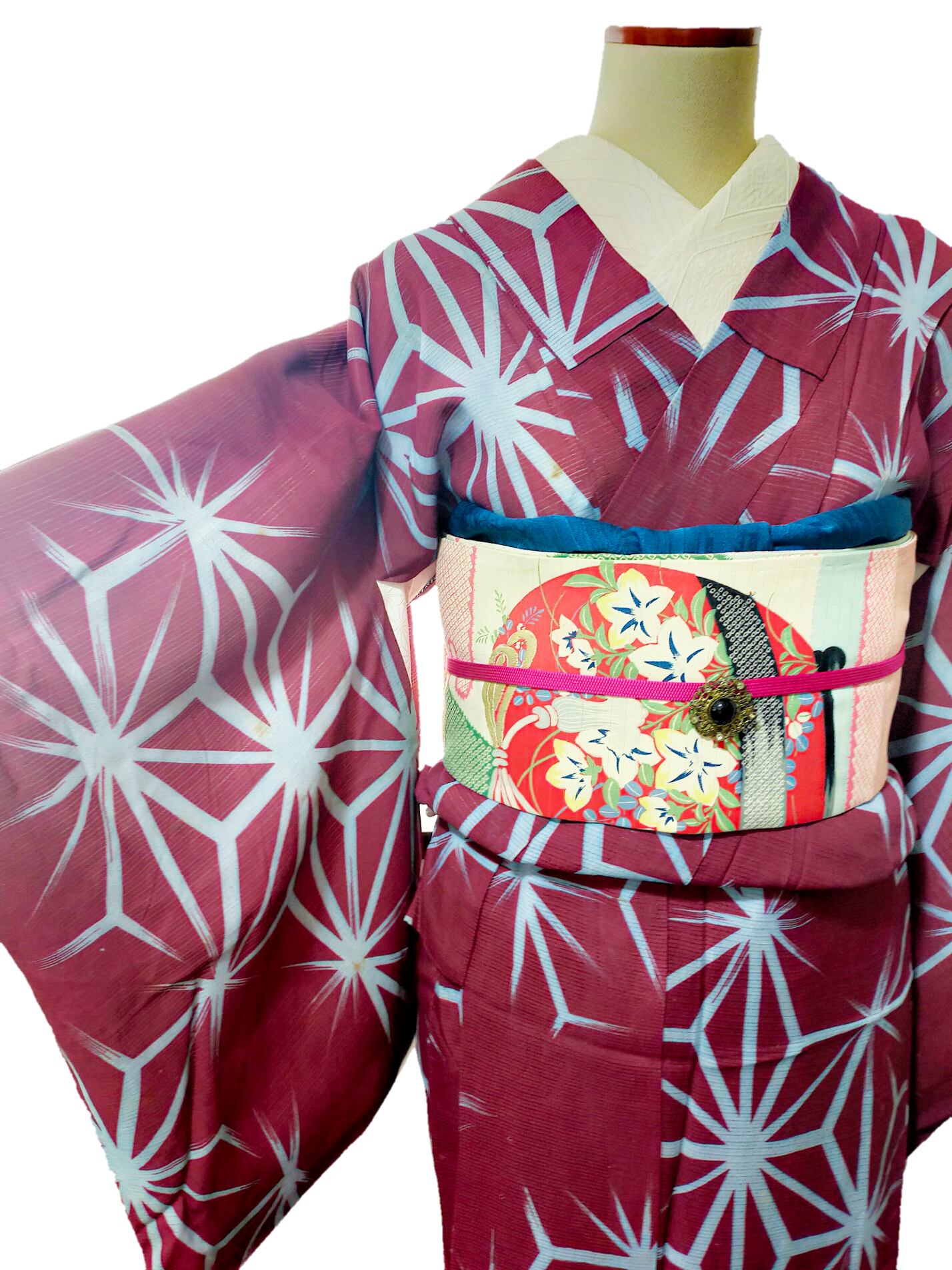 紫×水色の麻の葉柄、絽のアンティーク夏着物です。