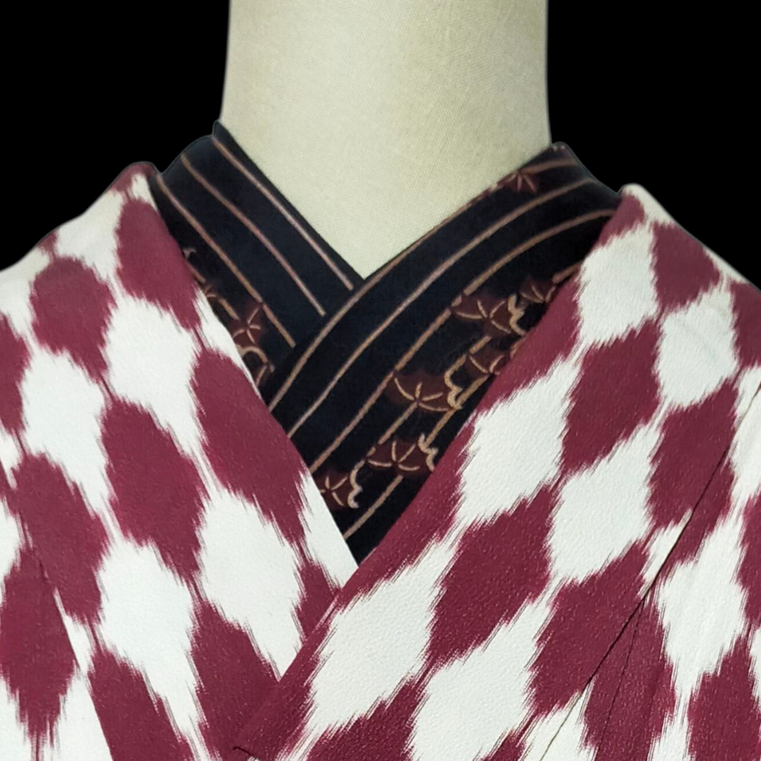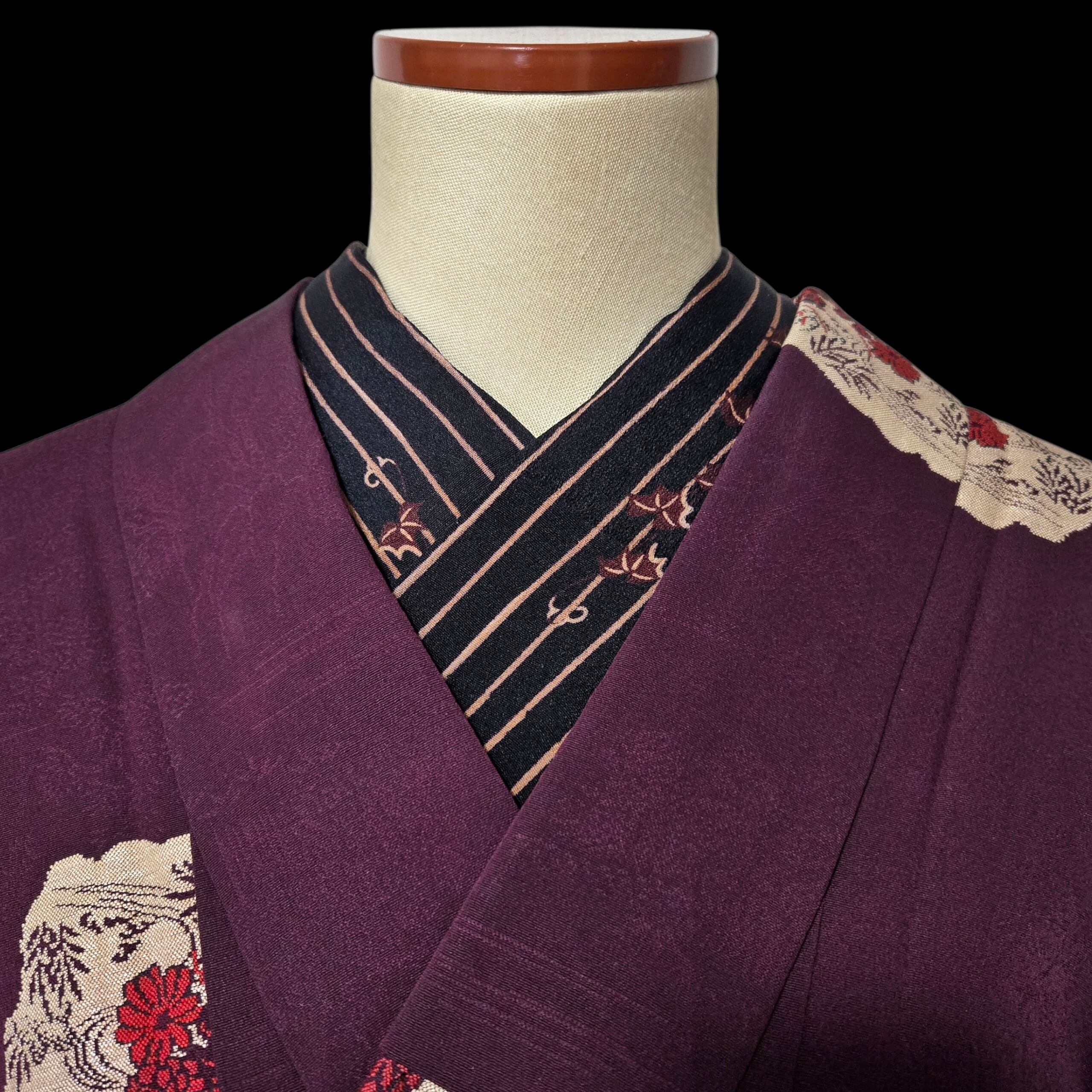 黒地によろけ縞と紅葉が描かれたシックな色柄のアンティーク生地で作った半衿。