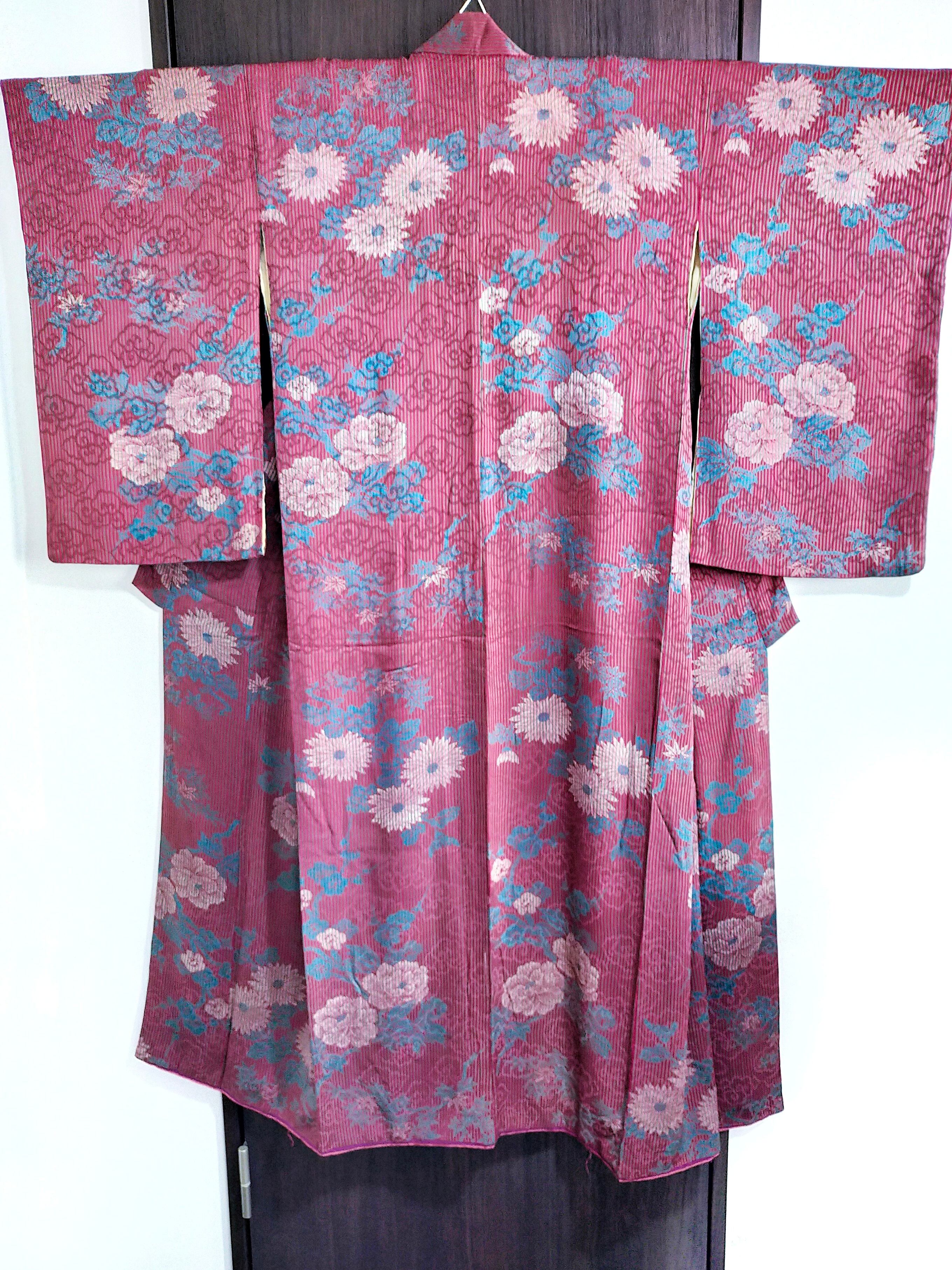 菊と牡丹に細かいストライプが入った袷着物に水色の様々な花が描かれた帯を合わせました。