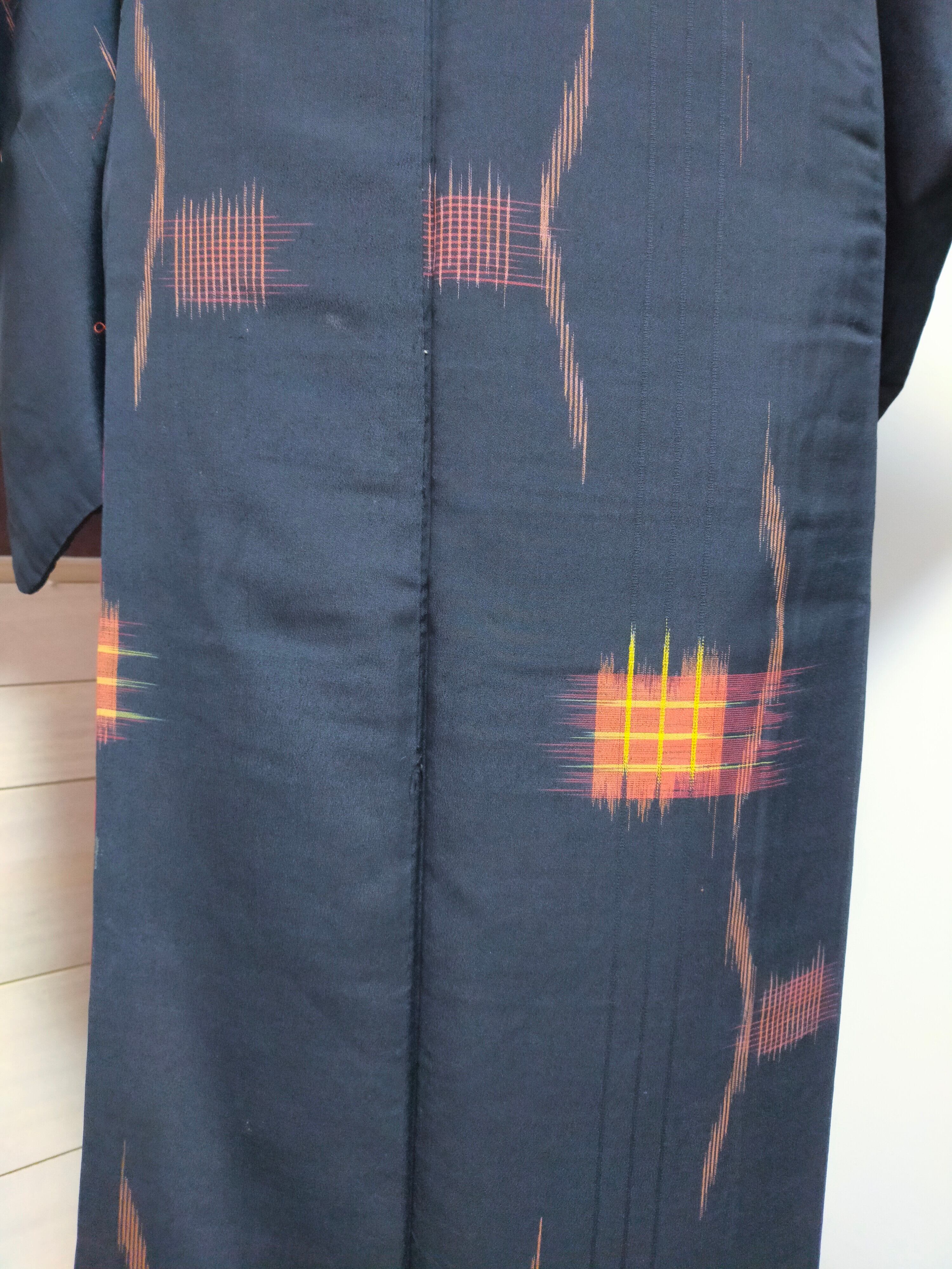 黒地に幾何学柄の着物に赤い花の帯を合わせました。