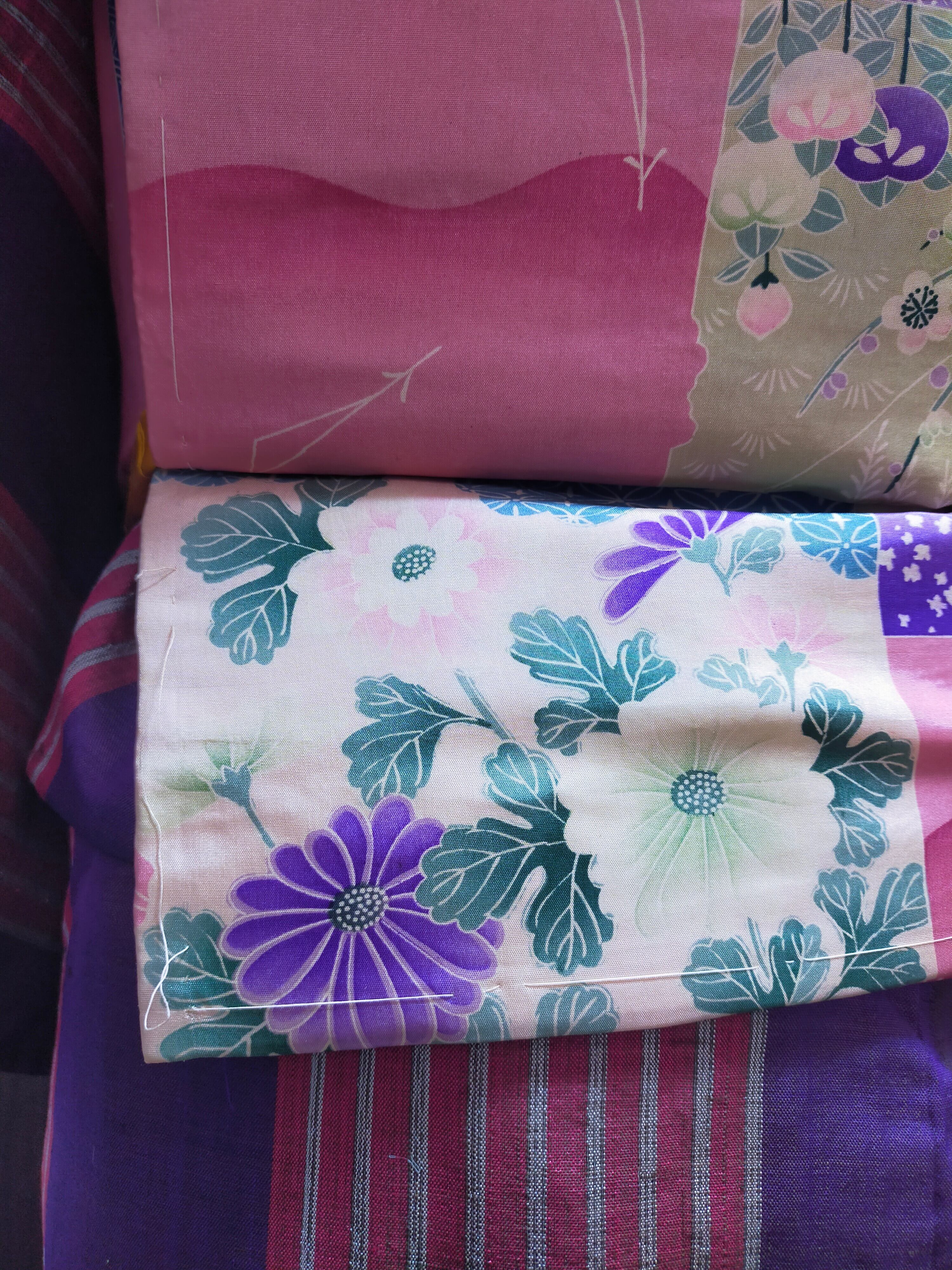 紫のレトロな縞柄紬着物にピンクの染帯を合わせました。