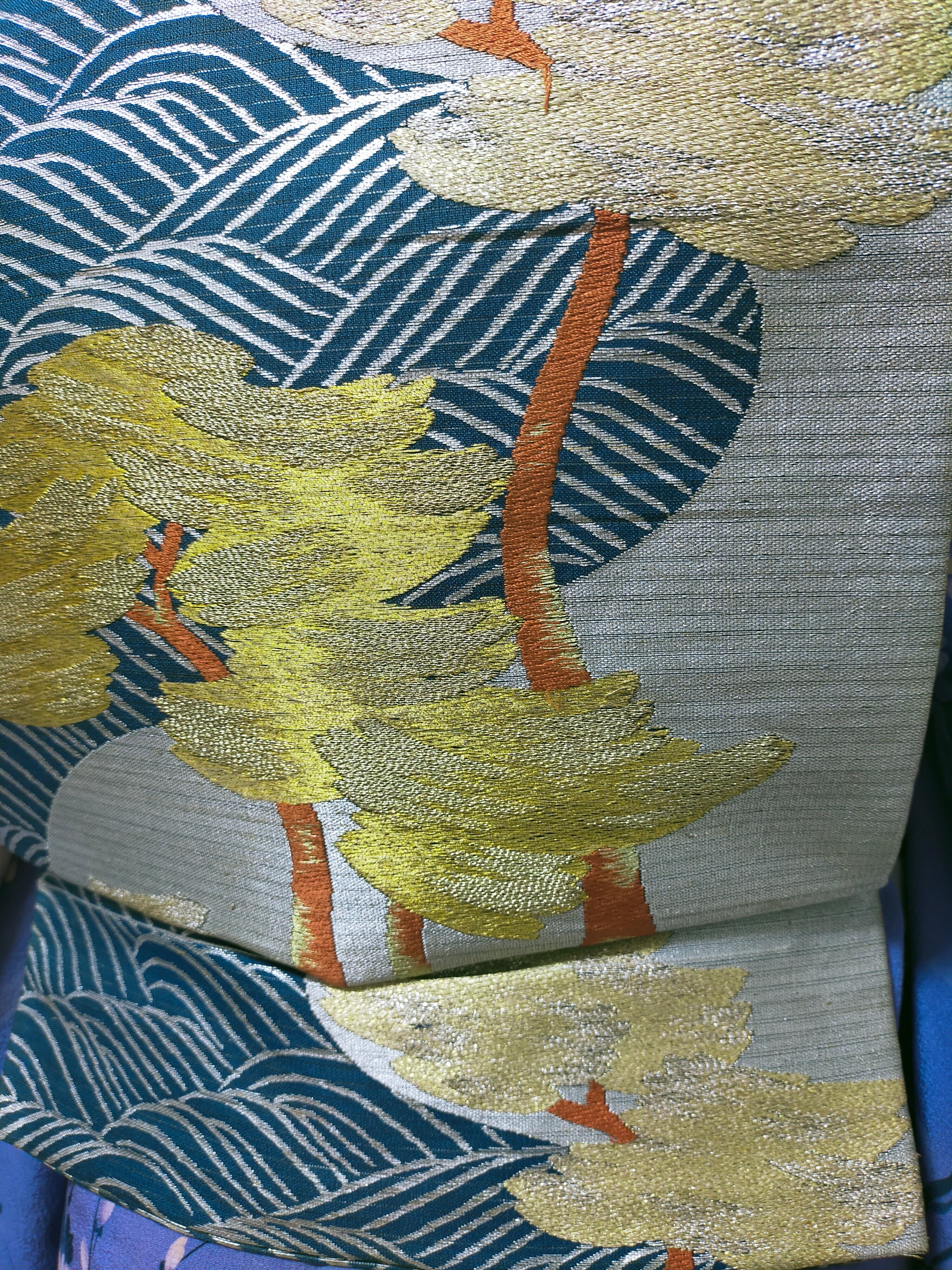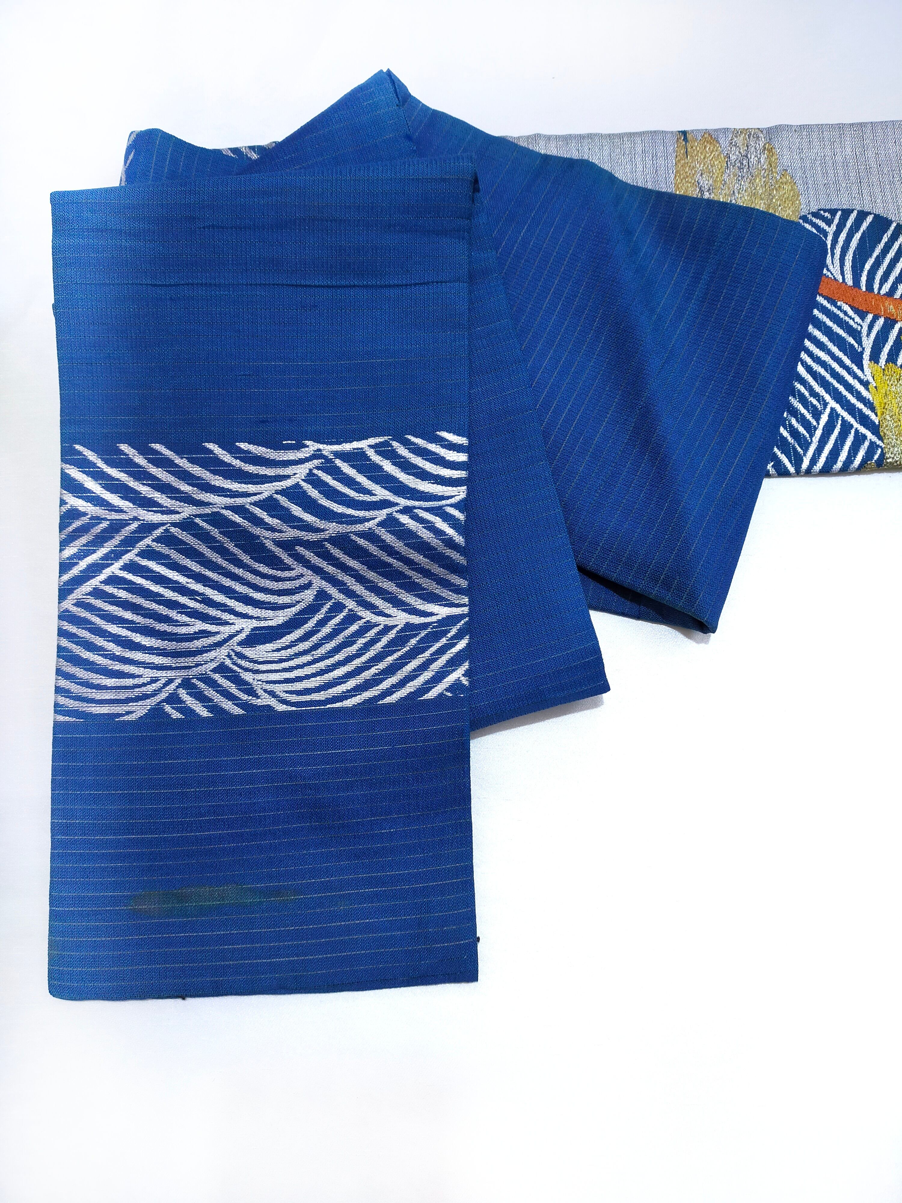 上品な青色の単衣着物に松と波が描かれたアンティーク夏名古屋帯を合わせました。
