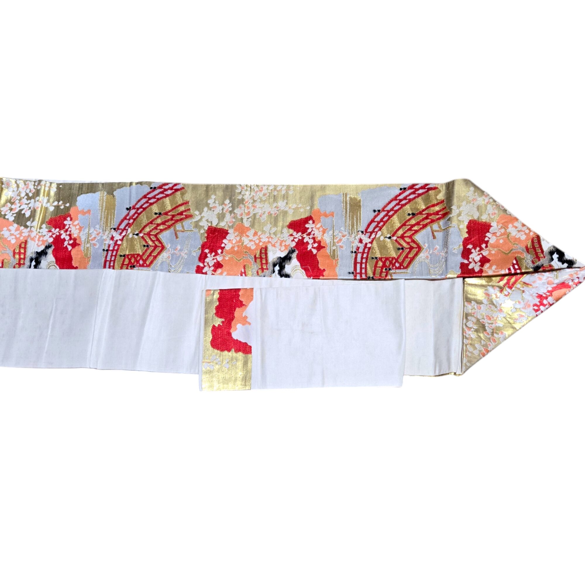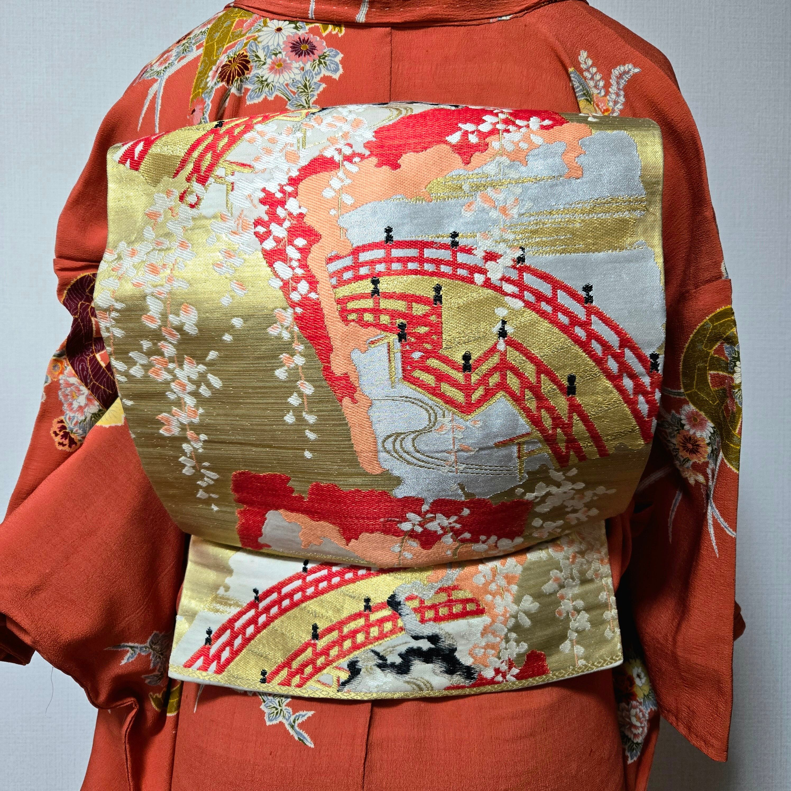 帯は川に掛かった橋や藤の木など川辺の様子が描かれた絵画の様です。