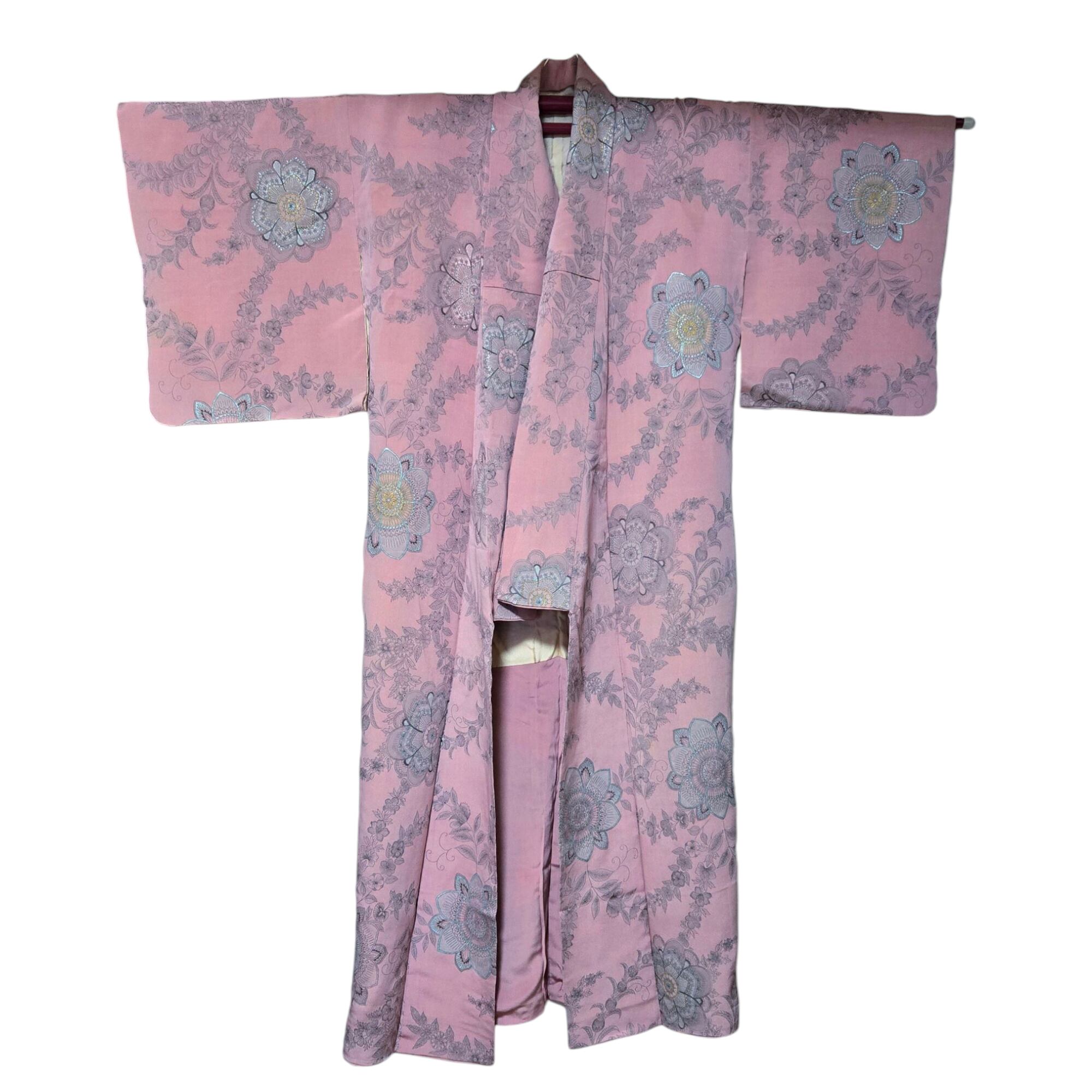 撫子色のお召着物にトーションレースの半幅帯を合わせて、上品洋風コーディネイト。